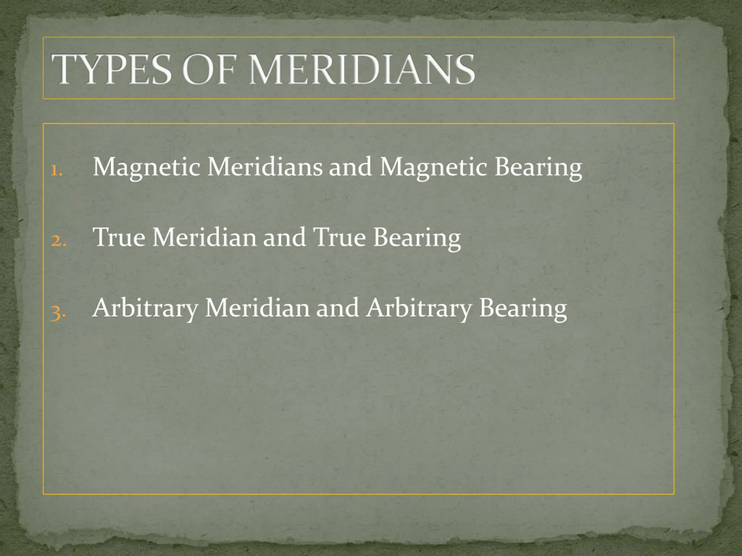 TYPES OF MERIDIANS Magnetic Meridians and Magnetic Bearing 1. True Meridian and True Bearing 2. Arbitrary Meridian and Arbitrary Bearing 3.