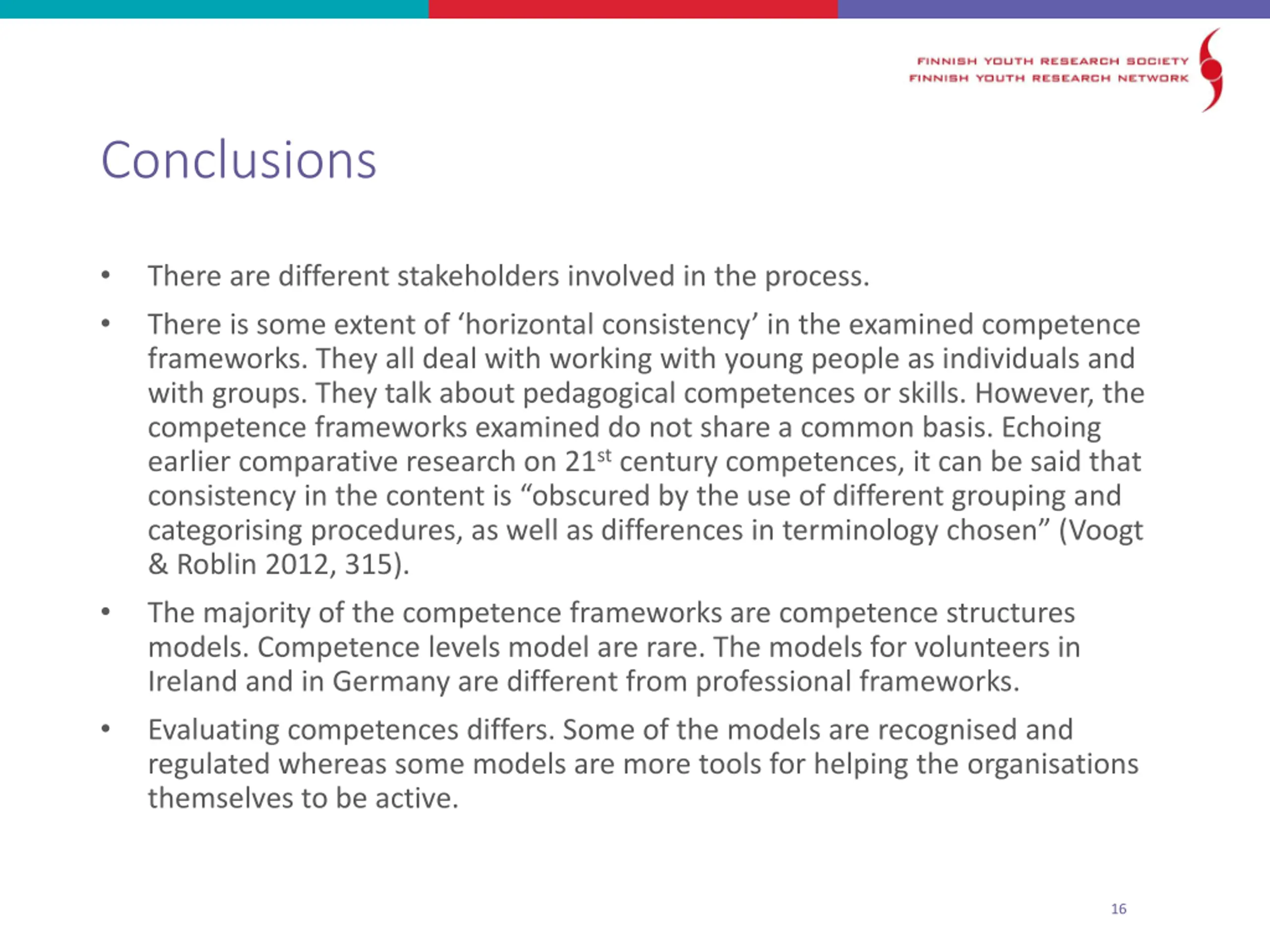 Conclusions There are different stakeholders involved in the process. There is some extent of horizontal consistency in the examined competence frameworks. They all deal with working with young people as individuals and with groups. They talk about pedagogical competences or skills. However, the competence frameworks examined do not share a common basis. Echoing earlier comparative research on 21stcentury competences, it can be said that consistency in the content is obscured by the use of different grouping and categorising procedures, as well as differences in terminology chosen (Voogt & Roblin 2012, 315). The majority of the competence frameworks are competence structures models. Competence levels model are rare. The models for volunteers in Ireland and in Germany are different from professional frameworks. Evaluating competences differs. Some of the models are recognised and regulated whereas some models are more tools for helping the organisations themselves to be active. 16