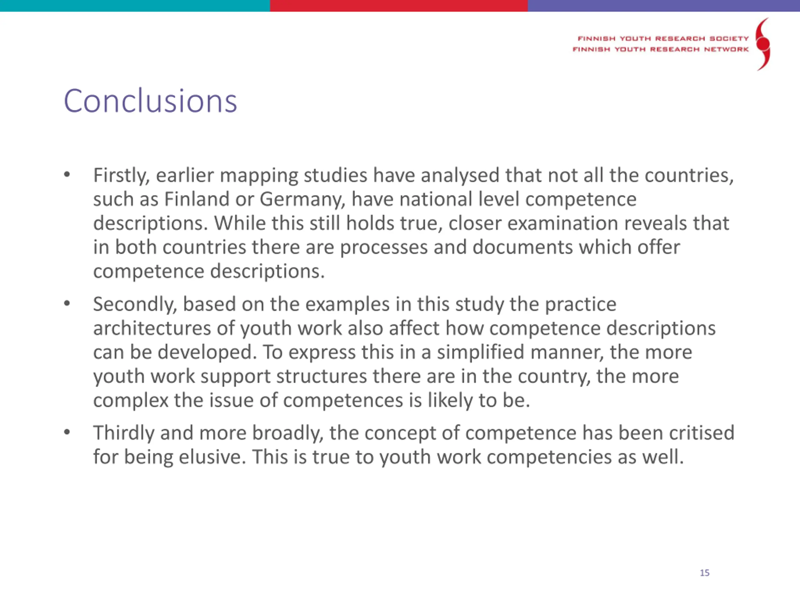 Conclusions Firstly, earlier mapping studies have analysed that not all the countries, such as Finland or Germany, have national level competence descriptions. While this still holds true, closer examination reveals that in both countries there are processes and documents which offer competence descriptions. Secondly, based on the examples in this study the practice architectures of youth work also affect how competence descriptions can be developed. To express this in a simplified manner, the more youth work support structures there are in the country, the more complex the issue of competences is likely to be. Thirdly and more broadly, the concept of competence has been critised for being elusive. This is true to youth work competencies as well. 15