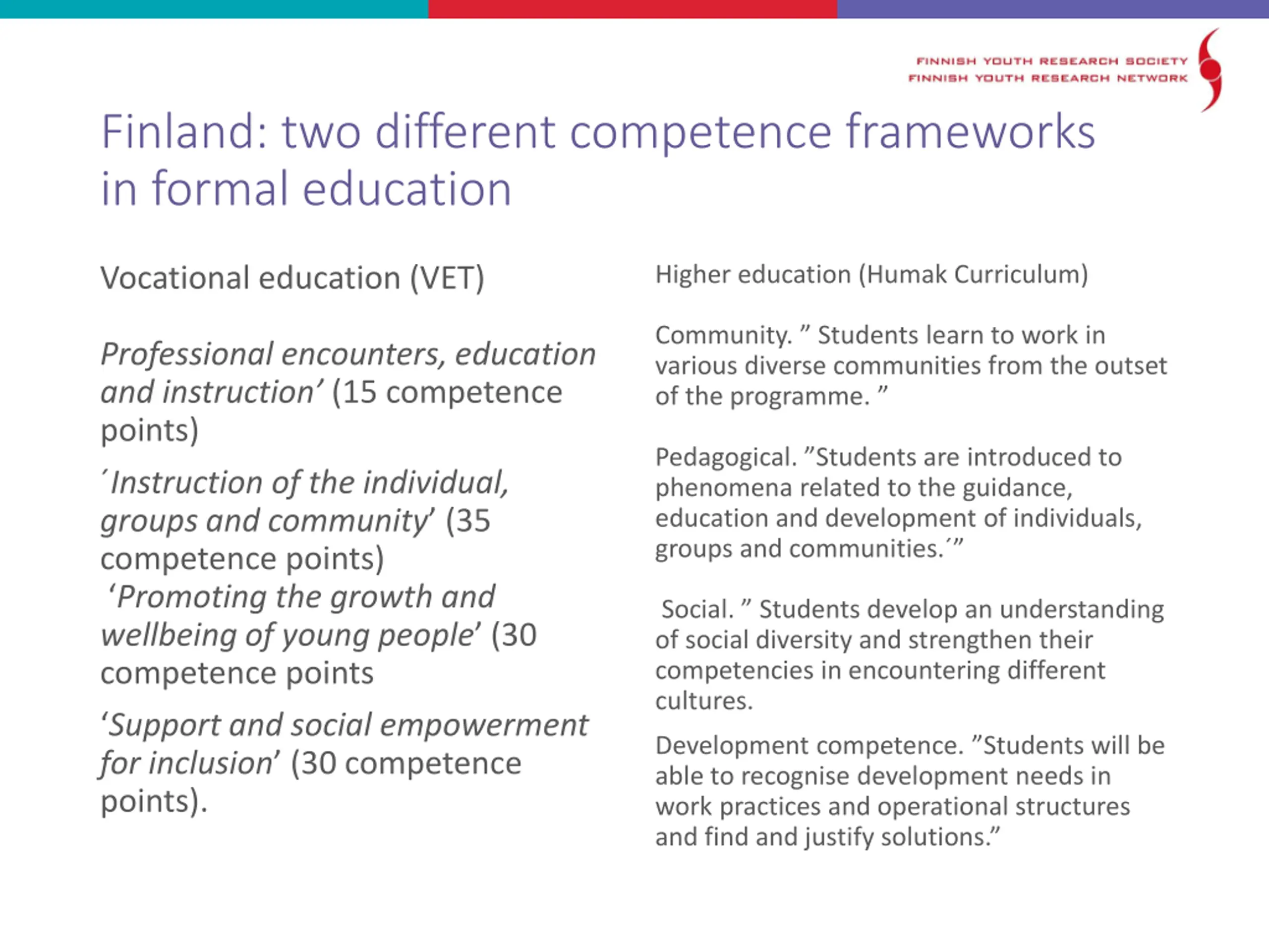 Finland: two different competence frameworks in formal education Higher education (Humak Curriculum) Vocational education (VET) Community. Students learn to work in various diverse communities from the outset of the programme. Professional encounters, education and instruction (15 competence points) Instruction of the individual, groups and community (35 competence points) Promoting the growth and wellbeing of young people (30 competence points Support and social empowerment for inclusion (30 competence points). Pedagogical. Students are introduced to phenomena related to the guidance, education and development of individuals, groups and communities. Social. Students develop an understanding of social diversity and strengthen their competencies in encountering different cultures. Development competence. Students will be able to recognise development needs in work practices and operational structures and find and justify solutions.