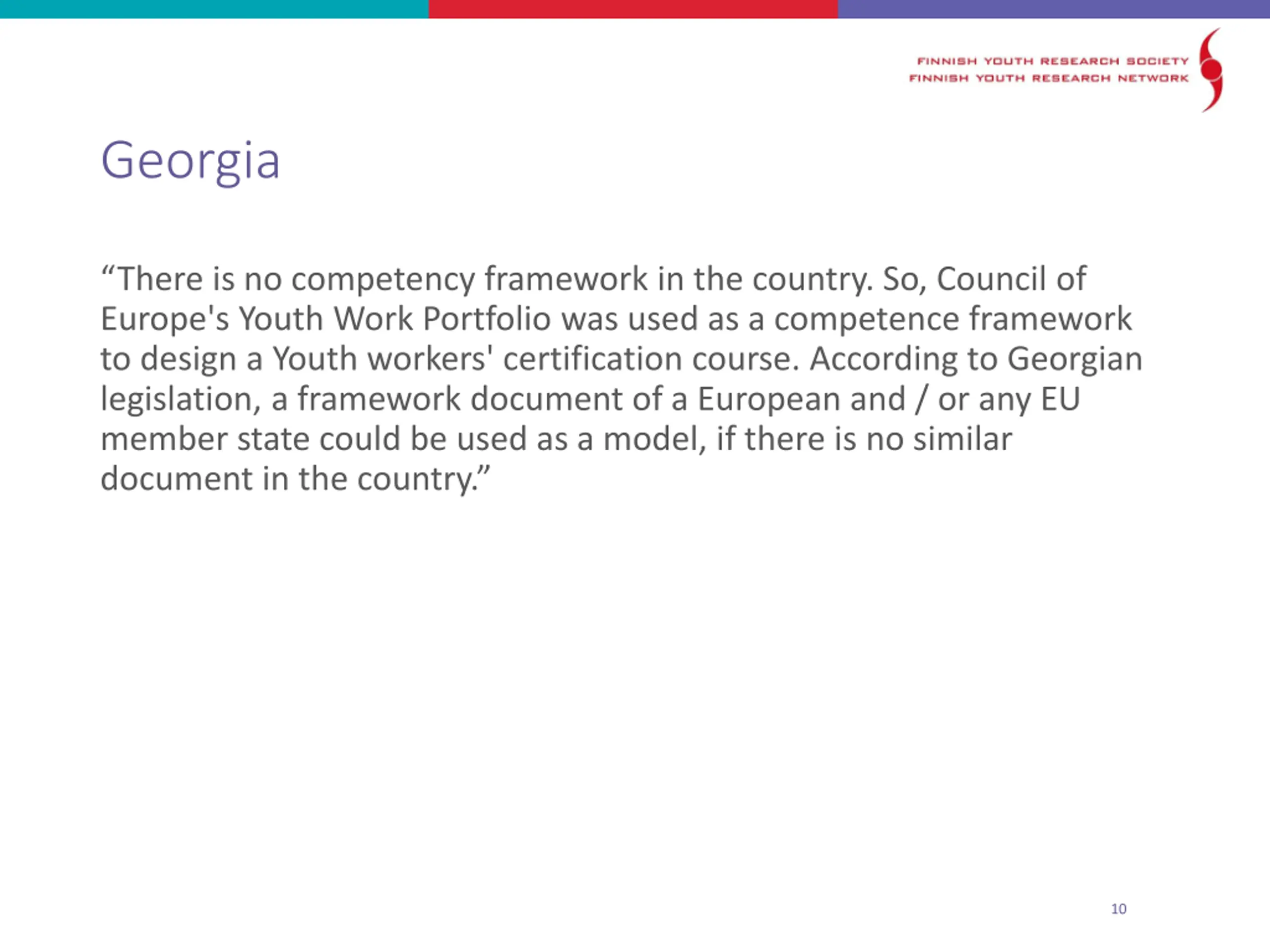 Georgia There is no competency framework in the country. So, Council of Europe's Youth Work Portfolio was used as a competence framework to design a Youth workers' certification course. According to Georgian legislation, a framework document of a European and / or any EU member state could be used as a model, if there is no similar document in the country. 10