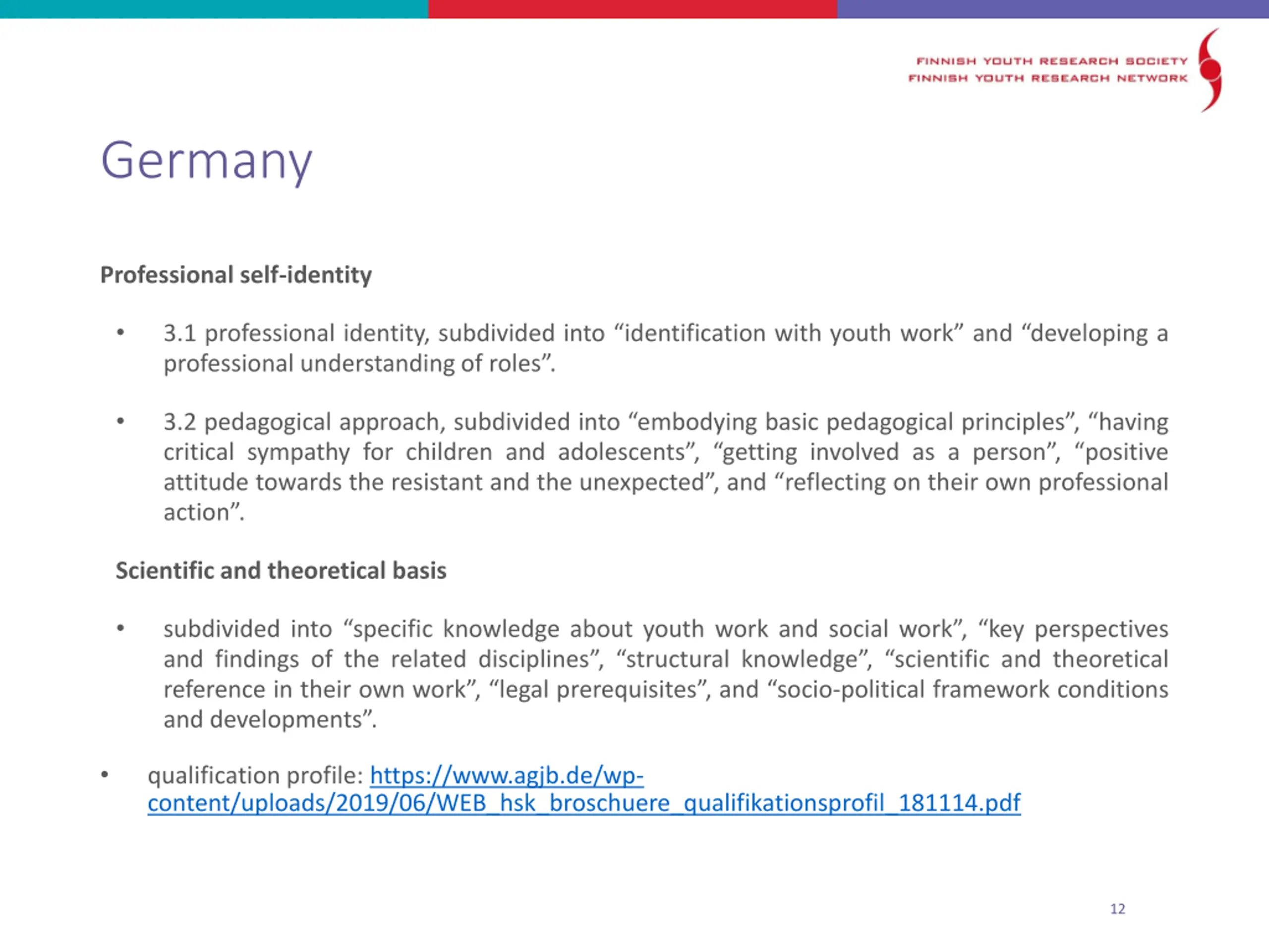 Germany Professional self-identity 3.1 professional identity, subdivided into identification with youth work and developing a professional understandingof roles . 3.2 pedagogical approach, subdivided into embodying basic pedagogical principles , having critical sympathy for children and adolescents , getting involved as a person , positive attitude towards the resistant and the unexpected , and reflecting on their own professional action . Scientific and theoretical basis subdivided into specific knowledge about youth work and social work , key perspectives and findings of the related disciplines , structural knowledge , scientific and theoretical reference in their own work , legal prerequisites , and socio-political framework conditions and developments . qualification profile: https://www.agjb.de/wp- content/uploads/2019/06/WEB_hsk_broschuere_qualifikationsprofil_181114.pdf 12
