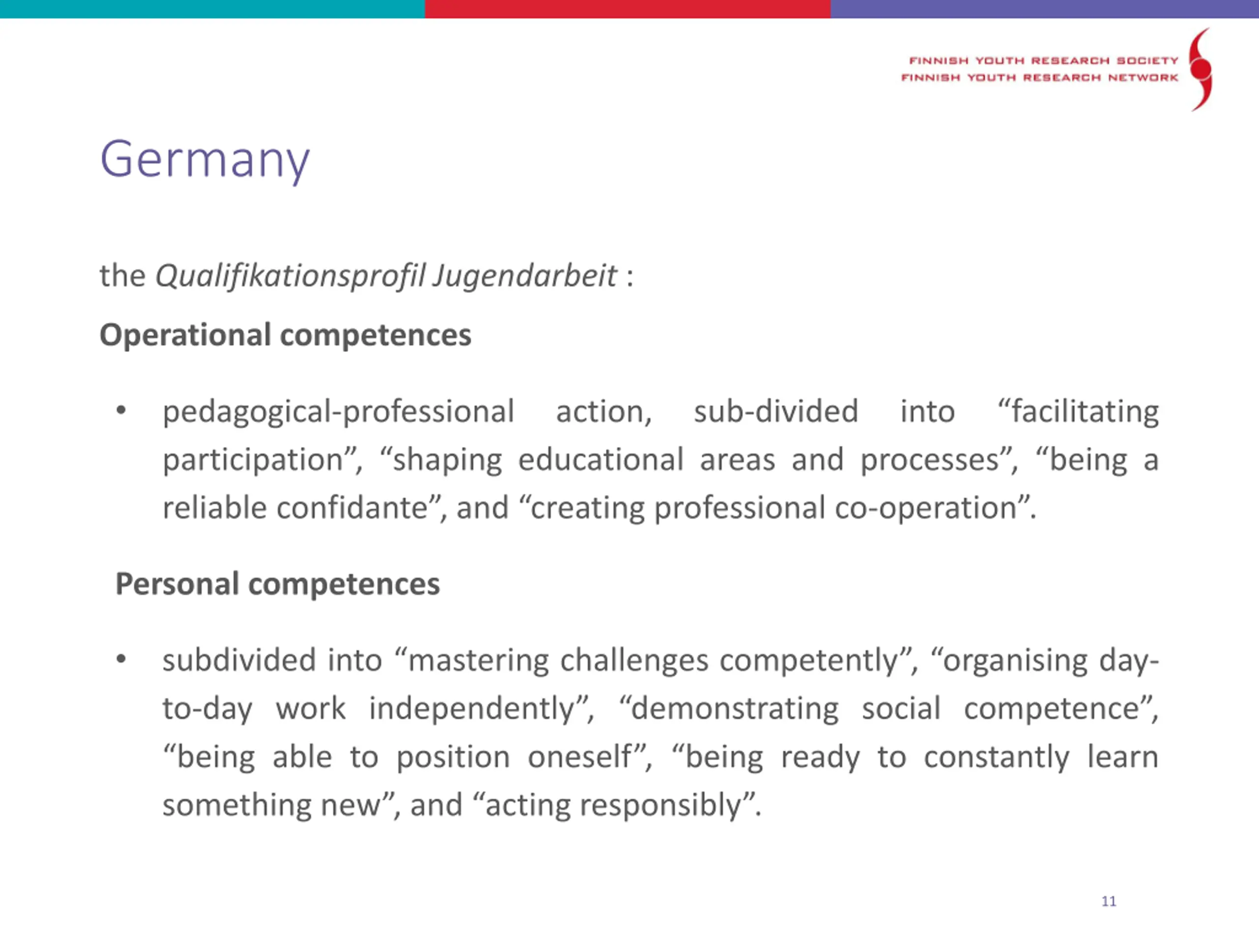 Germany the Qualifikationsprofil Jugendarbeit : Operational competences pedagogical-professional participation , shaping educational areas and processes , being a reliable confidante , and creating professional co-operation . action, sub-divided into facilitating Personal competences subdivided into mastering challenges competently , organising day- to-day work independently , demonstrating social competence , being able to position oneself , being ready to constantly learn something new , and acting responsibly . 11