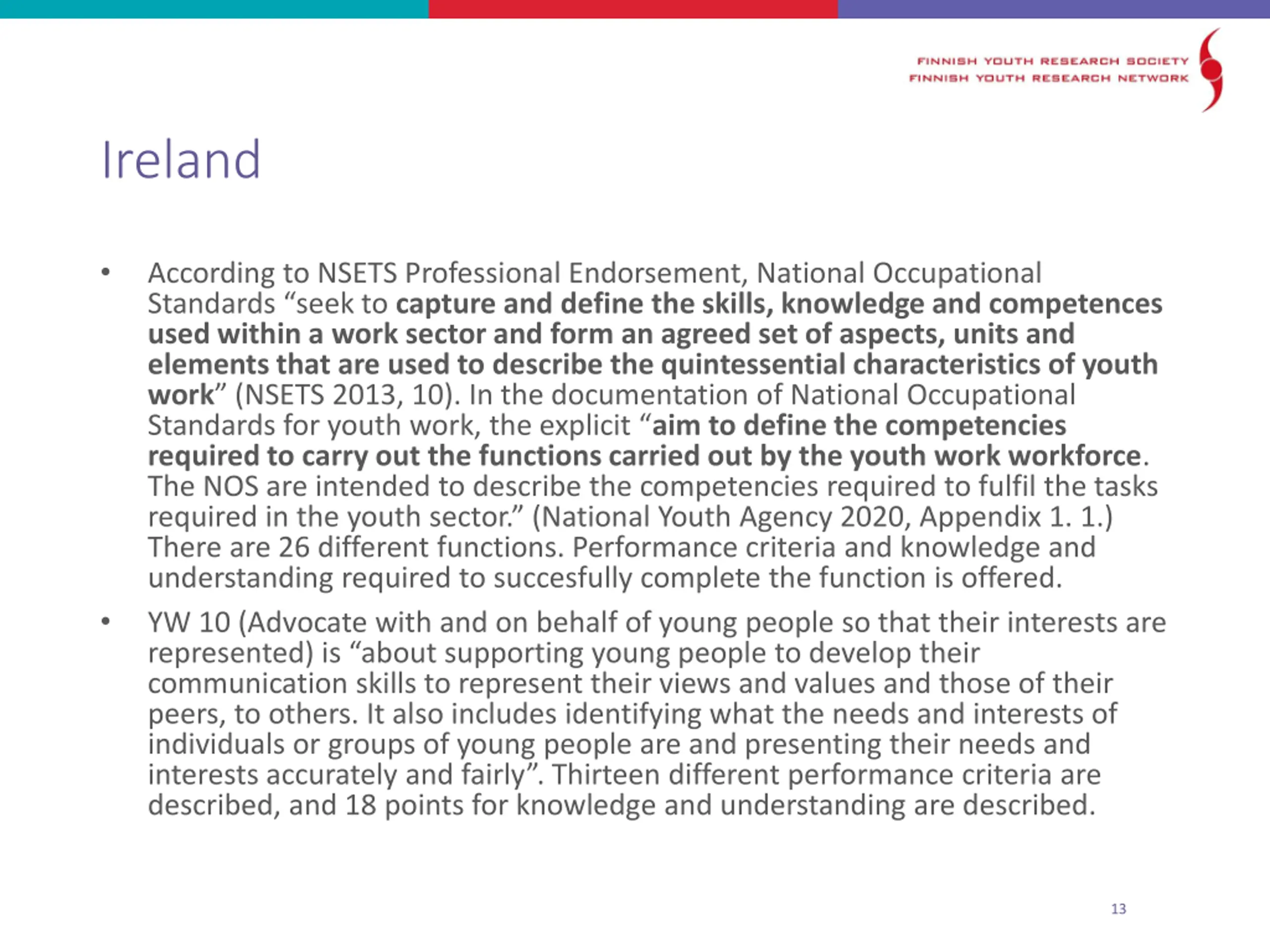Ireland According to NSETS Professional Endorsement, National Occupational Standards seek to capture and define the skills, knowledge and competences used within a work sector and form an agreed set of aspects, units and elements that are used to describe the quintessential characteristics of youth work (NSETS 2013, 10). In the documentation of National Occupational Standards for youth work, the explicit aim to define the competencies required to carry out the functions carried out by the youth work workforce. The NOS are intended to describe the competencies required to fulfil the tasks required in the youth sector. (National Youth Agency 2020, Appendix 1. 1.) There are 26 different functions. Performance criteria and knowledge and understanding required to succesfully complete the function is offered. YW 10 (Advocate with and on behalf of young people so that their interests are represented) is about supporting young people to develop their communication skills to represent their views and values and those of their peers, to others. It also includes identifying what the needs and interests of individuals or groups of young people are and presenting their needs and interests accurately and fairly . Thirteen different performance criteria are described, and 18 points for knowledge and understanding are described. 13