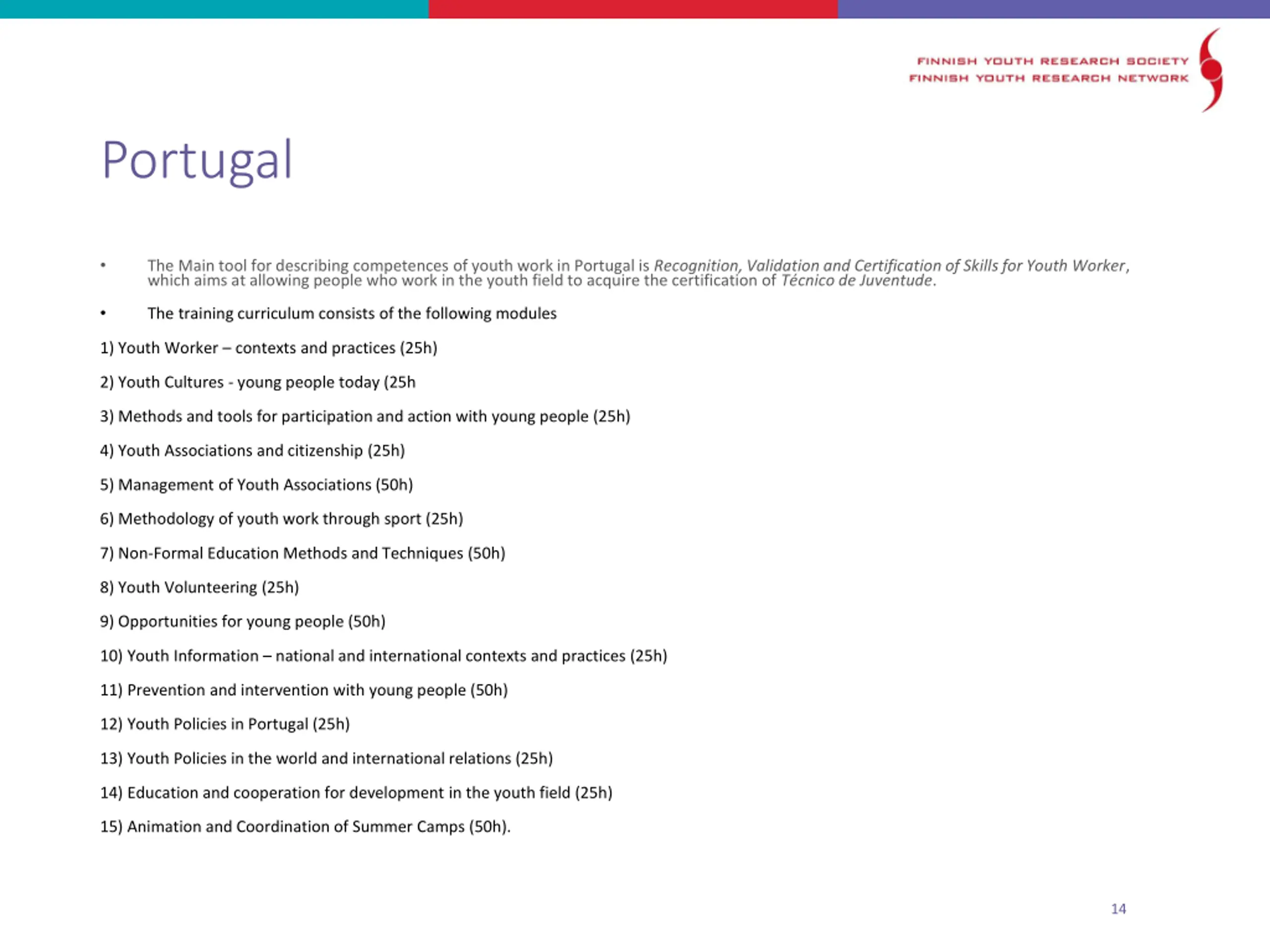 Portugal The Main tool for describing competences of youth work in Portugal is Recognition, Validation and Certification of Skills for Youth Worker, which aims at allowing people who work in the youth field to acquire the certification of T cnico de Juventude. The training curriculum consists of the following modules 1) Youth Worker contexts and practices (25h) 2) Youth Cultures - young people today (25h 3) Methods and tools for participation and action with young people (25h) 4) Youth Associations and citizenship (25h) 5) Management of Youth Associations (50h) 6) Methodology of youth work through sport (25h) 7) Non-Formal Education Methods and Techniques (50h) 8) Youth Volunteering (25h) 9) Opportunities for young people (50h) 10) Youth Information national and international contexts and practices (25h) 11) Prevention and intervention with young people (50h) 12) Youth Policies in Portugal (25h) 13) Youth Policies in the world and international relations (25h) 14) Education and cooperation for development in the youth field (25h) 15) Animation and Coordination of Summer Camps (50h). 14