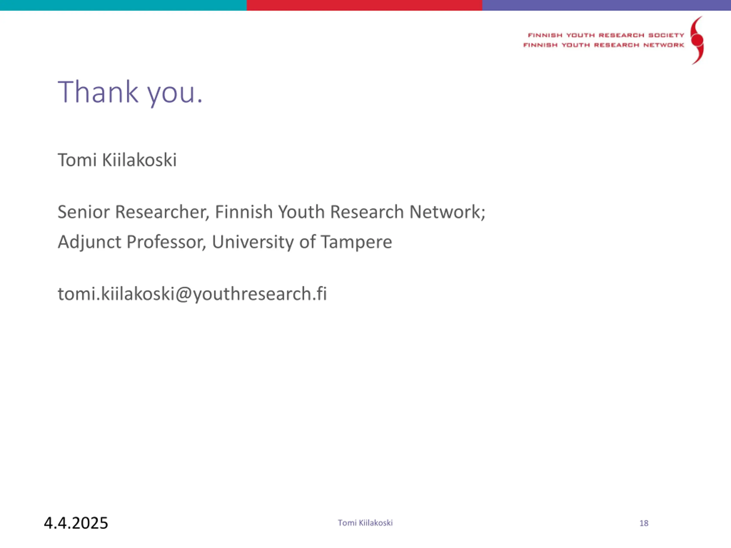 Thank you. Tomi Kiilakoski Senior Researcher, Finnish Youth Research Network; Adjunct Professor, University of Tampere tomi.kiilakoski@youthresearch.fi 4.4.2025 Tomi Kiilakoski 18
