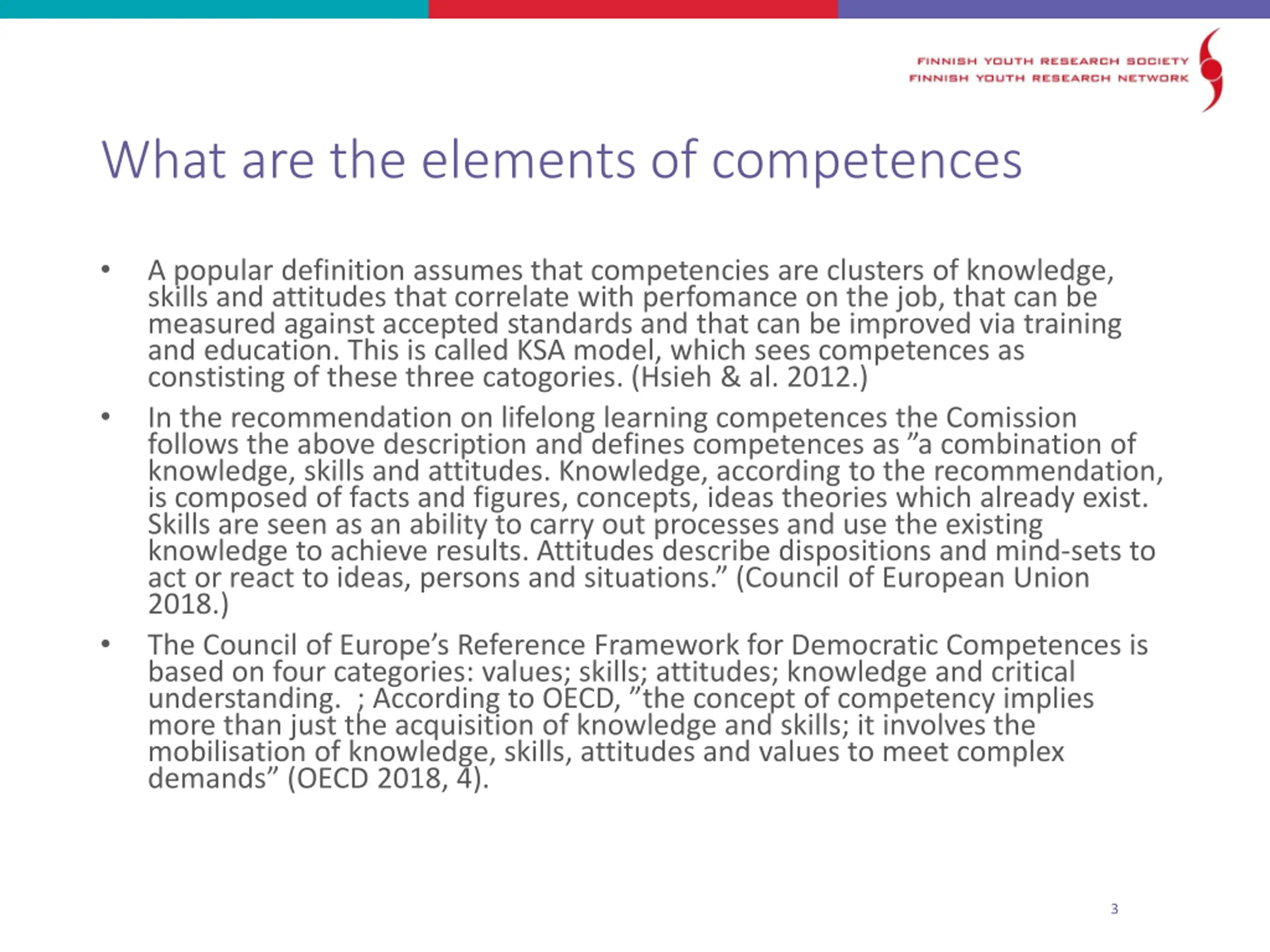 What are the elements of competences A popular definition assumes that competencies are clusters of knowledge, skills and attitudes that correlate with perfomance on the job, that can be measured against accepted standards and that can be improved via training and education. This is called KSA model, which sees competences as constisting of these three catogories. (Hsieh & al. 2012.) In the recommendation on lifelong learning competences the Comission follows the above description and defines competences as a combination of knowledge, skills and attitudes. Knowledge, according to the recommendation, is composed of facts and figures, concepts, ideas theories which already exist. Skills are seen as an ability to carry out processes and use the existing knowledge to achieve results. Attitudes describe dispositions and mind-sets to act or react to ideas, persons and situations. (Council of European Union 2018.) The Council of Europe s Reference Framework for Democratic Competences is based on four categories: values; skills; attitudes; knowledge and critical understanding. ; According to OECD, the concept of competency implies more than just the acquisition of knowledge and skills; it involves the mobilisation of knowledge, skills, attitudes and values to meet complex demands (OECD 2018, 4). 3