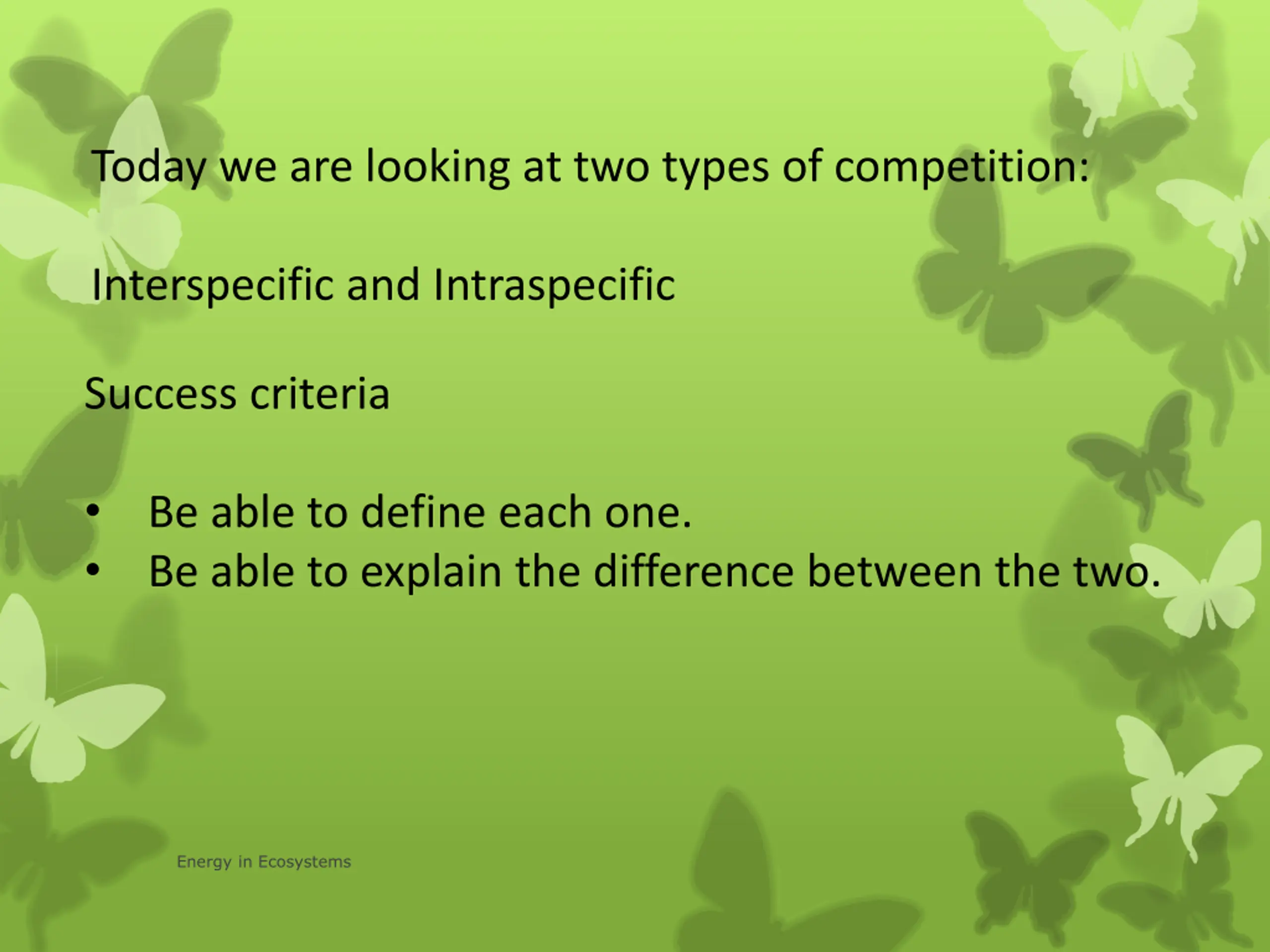 Today we are looking at two types of competition: Interspecific and Intraspecific Success criteria Be able to define each one. Be able to explain the difference between the two. Energy in Ecosystems