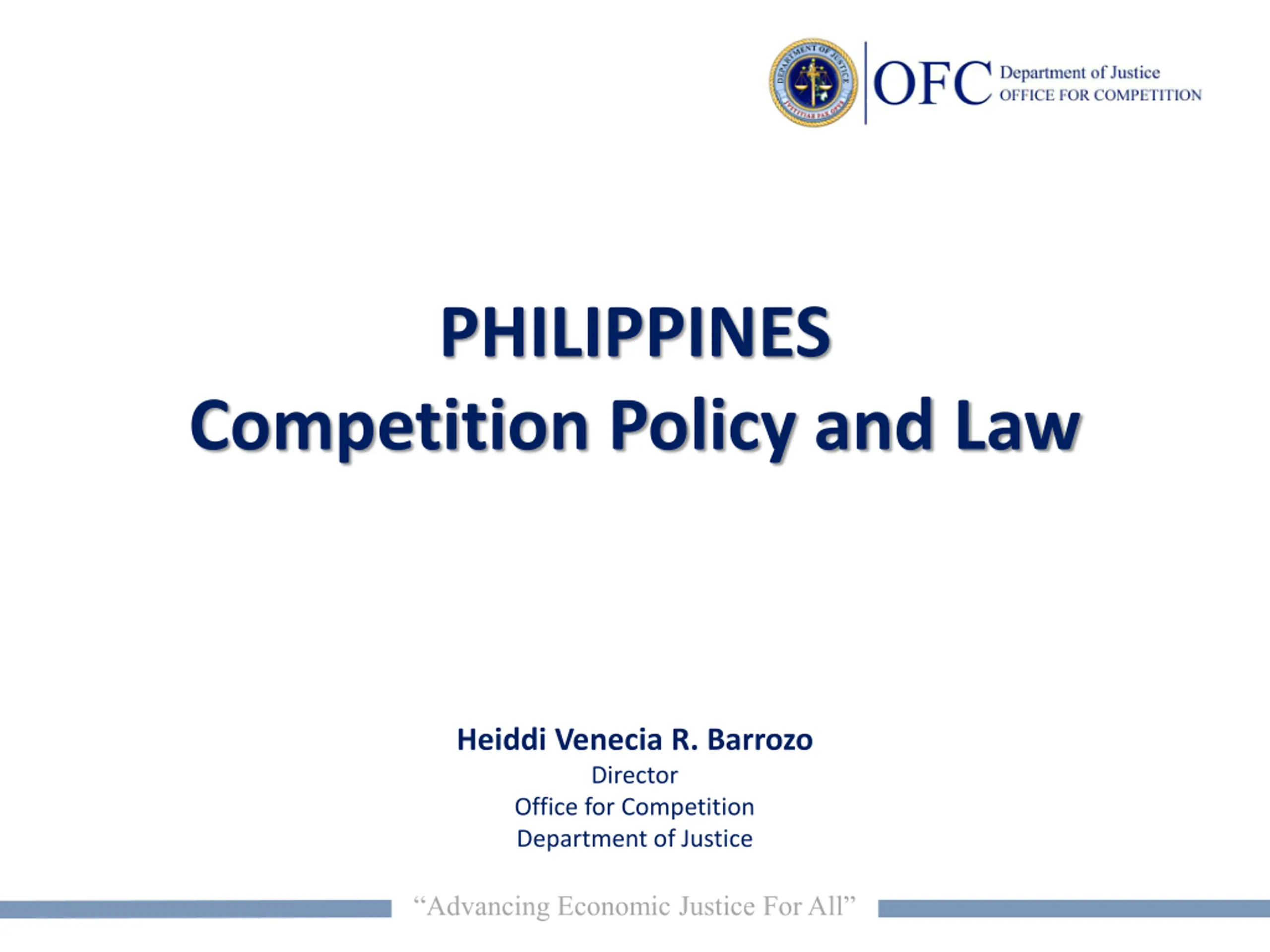 PHILIPPINES Competition Policy and Law Heiddi Venecia R. Barrozo Director Office for Competition Department of Justice Advancing Economic Justice For All