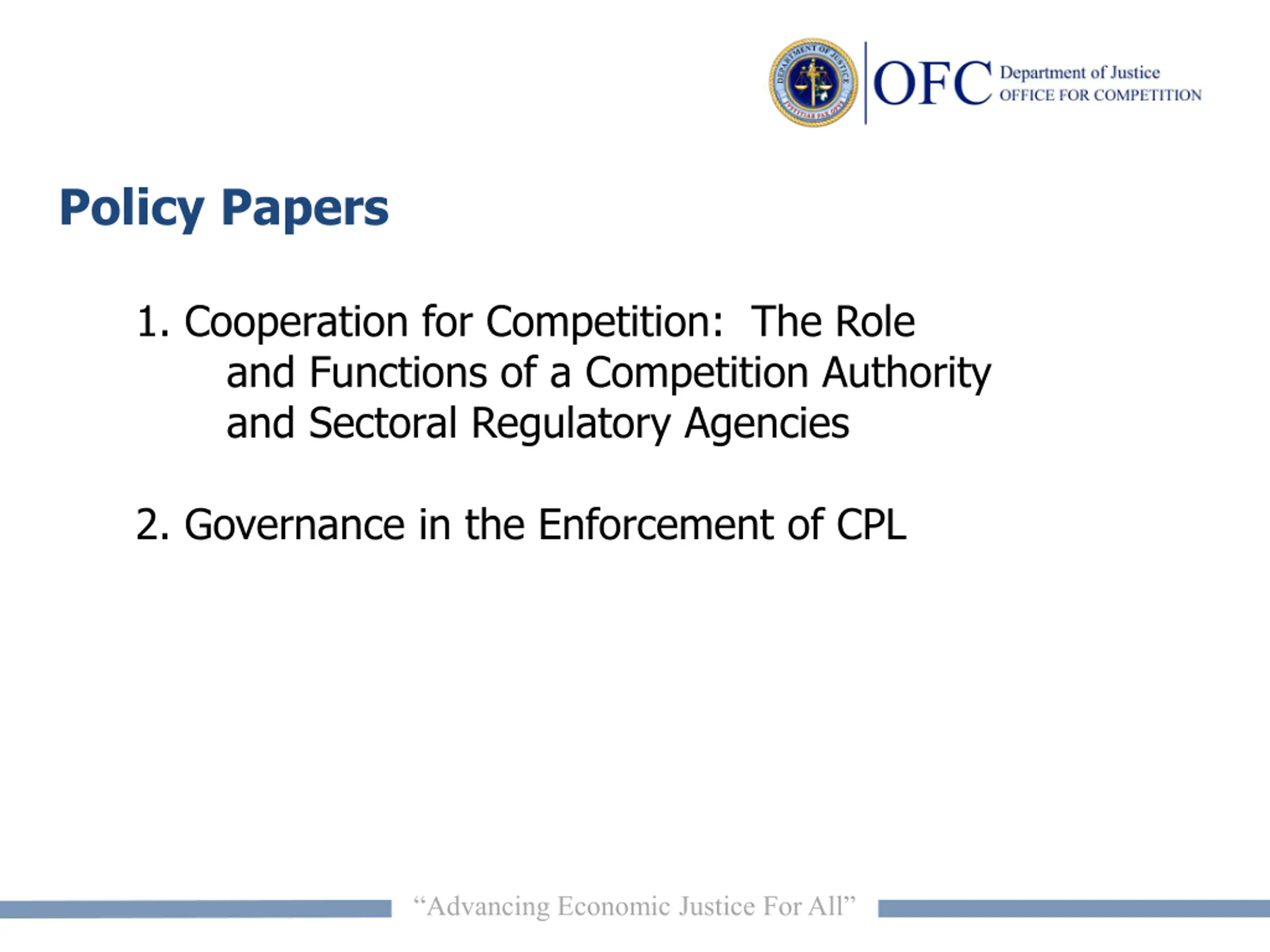 Policy Papers 1. Cooperation for Competition: The Role and Functions of a Competition Authority and Sectoral Regulatory Agencies 2. Governance in the Enforcement of CPL Advancing Economic Justice For All