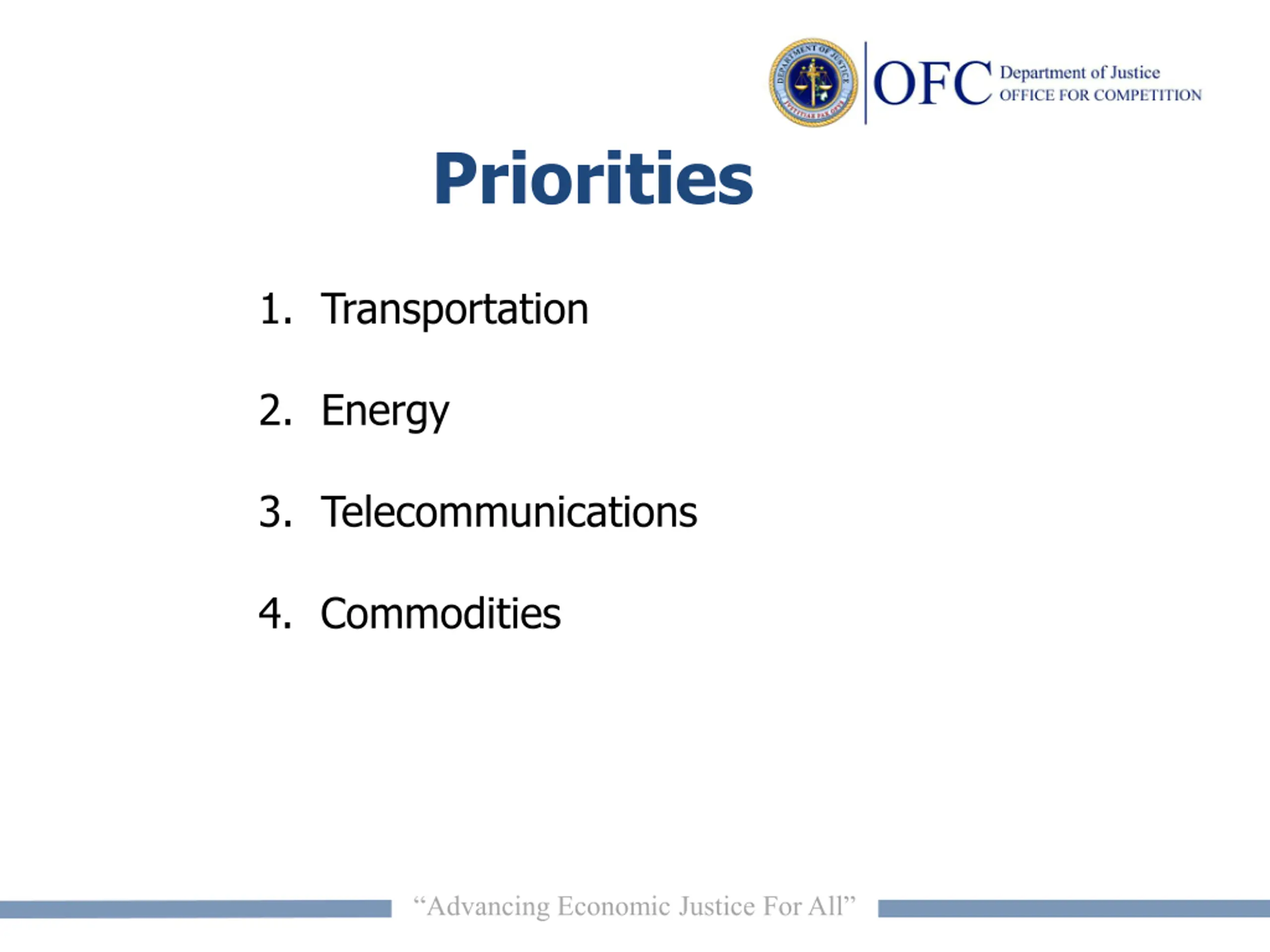 Priorities 1. Transportation 2. Energy 3. Telecommunications 4. Commodities Advancing Economic Justice For All