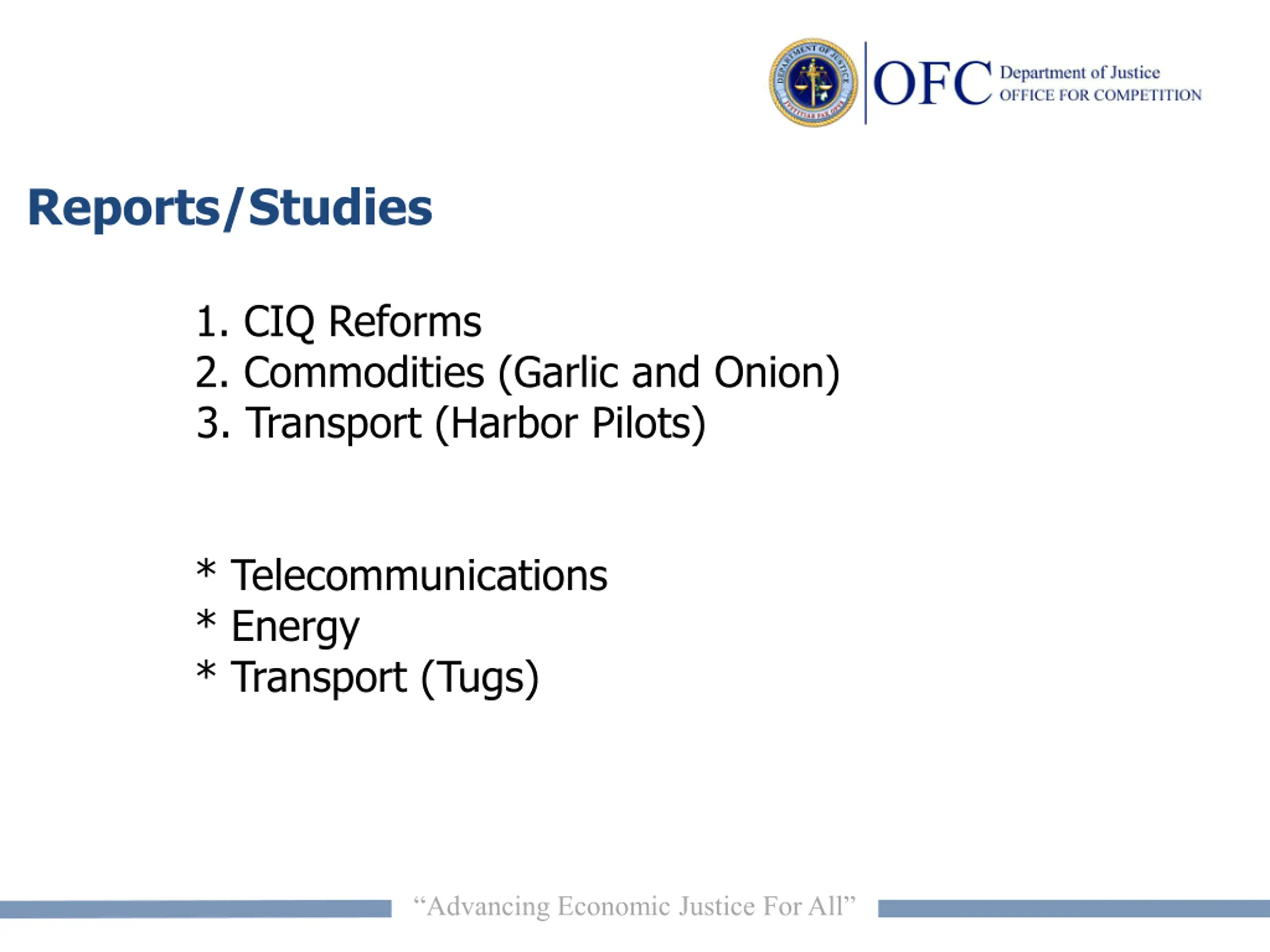 Reports/Studies 3. Transport (Harbor Pilots) * Telecommunications * Energy * Transport (Tugs) 1. CIQ Reforms 2. Commodities (Garlic and Onion) Advancing Economic Justice For All