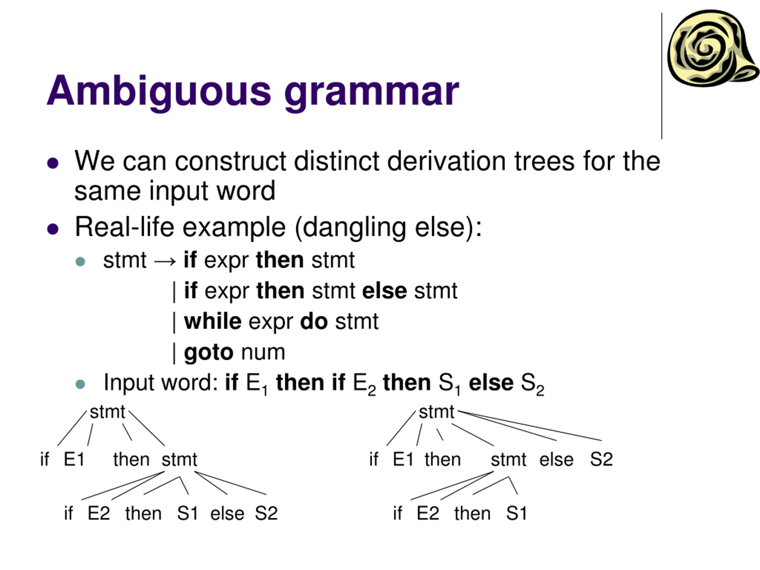 Ambiguous grammar We can construct distinct derivation trees for the same input word Real-life example (dangling else): stmt if expr then stmt | if expr then stmt else stmt | while expr do stmt | goto num Input word: if E1thenif E2then S1else S2 stmt stmt if E1 then stmt if E1 then stmt else S2 if E2 then S1 else S2 if E2 then S1