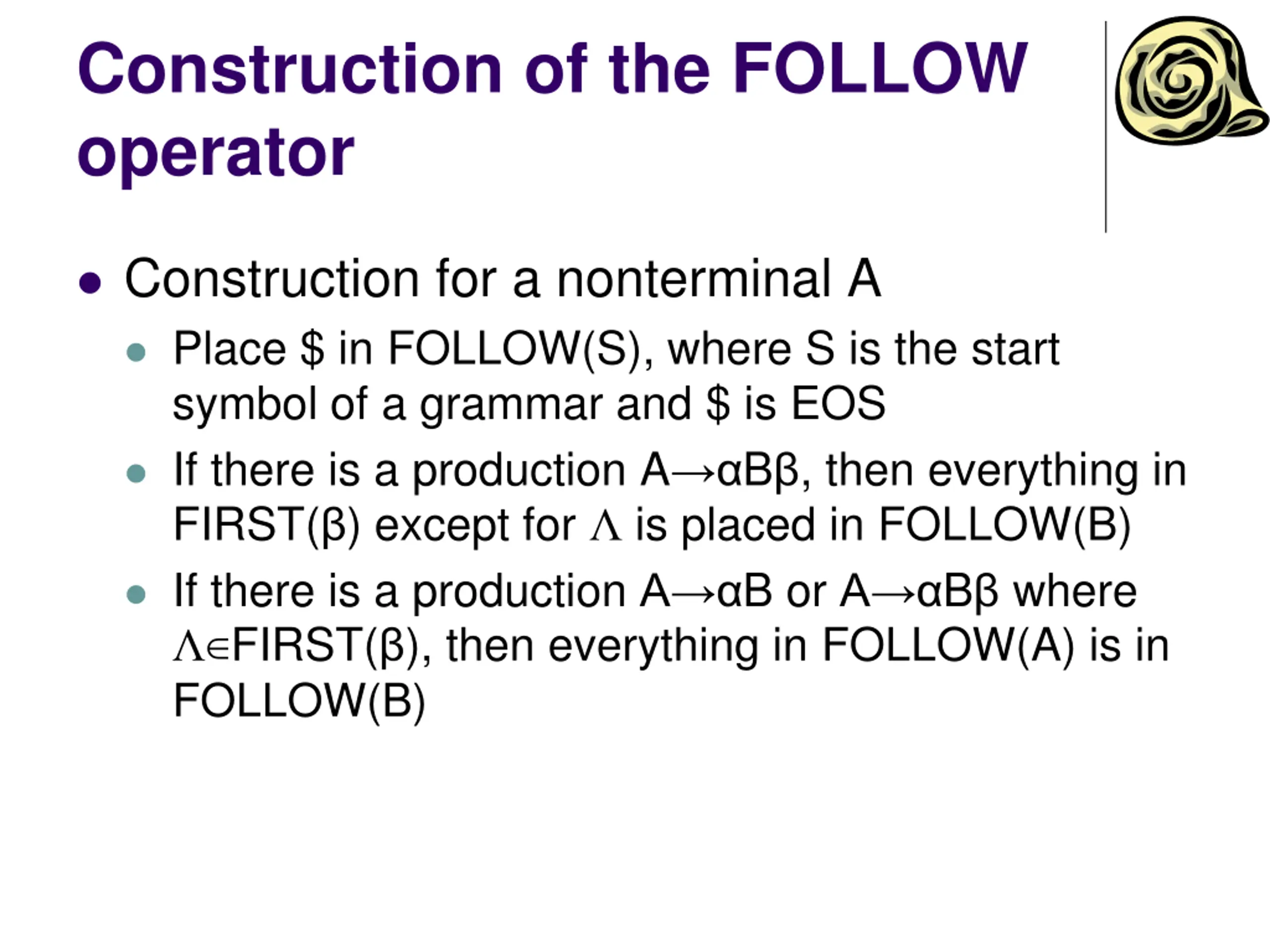 Construction of the FOLLOW operator Construction for a nonterminal A Place $ in FOLLOW(S), where S is the start symbol of a grammar and $ is EOS If there is a production A B , then everything in FIRST( ) except for is placed in FOLLOW(B) If there is a production A B or A B where FIRST( ), then everything in FOLLOW(A) is in FOLLOW(B)