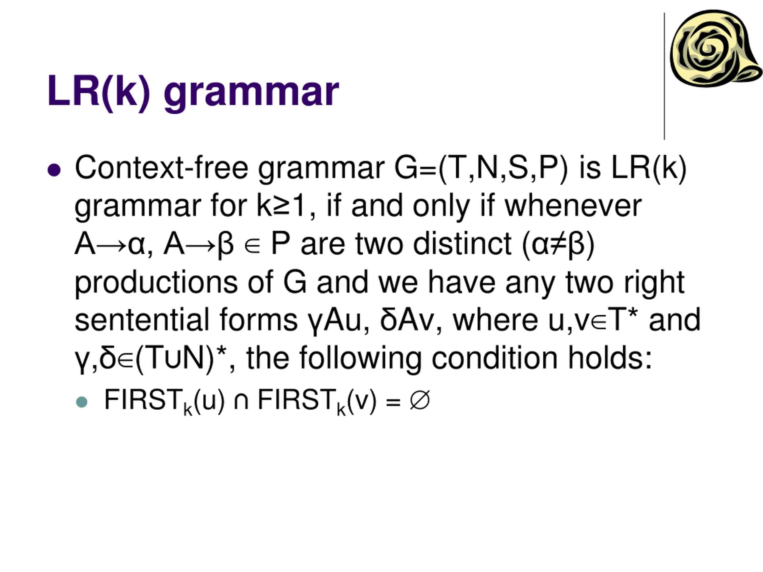 LR(k) grammar Context-free grammar G=(T,N,S,P) is LR(k) grammar for k 1, if and only if whenever A , A P are two distinct ( ) productions of G and we have any two right sentential forms Au, Av, where u,v T* and , (T N)*, the following condition holds: FIRSTk(u) FIRSTk(v) =