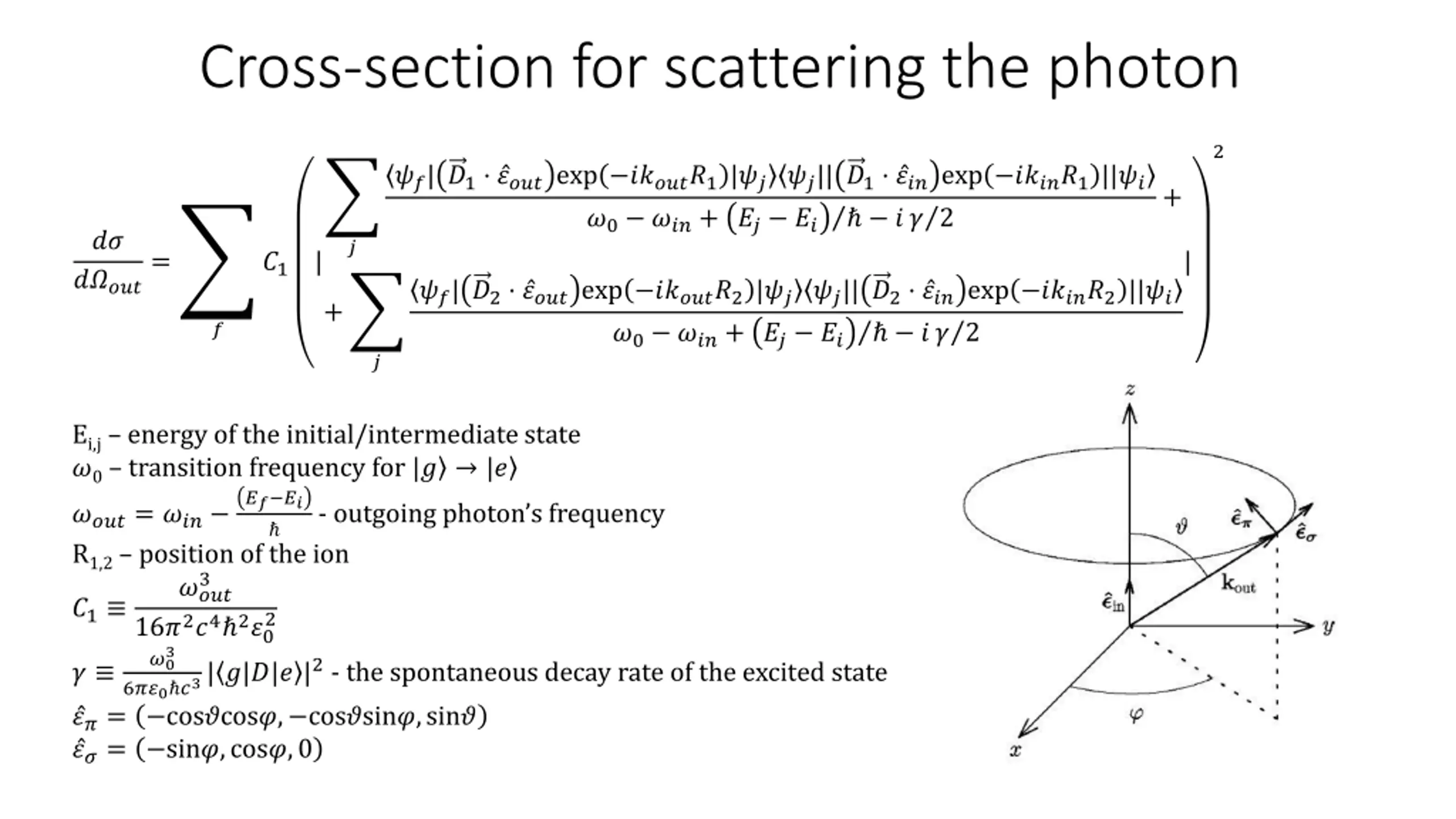Cross-section for scattering the photon 2 ??| ?1 ????exp ??????1|?? ??|| ?1 ???exp ?????1||?? ?0 ???+ ?? ?? + ? ? 2 ?? ? = ?1 | | ????? ??| ?2 ????exp ??????2|?? ??|| ?2 ???exp ?????2||?? ?0 ???+ ?? ?? + ? ? 2 ? ? Ei,j energy of the initial/intermediate state ?0 transition frequency for ?? ?? - outgoing photon s frequency R1,2 position of the ion ???? 16?2?4 2?0 ? |? |? ????= ??? 3 ?1 2 3 ?0 6??0 ?3| ?|?|? |2 - the spontaneous decay rate of the excited state ??= cos?cos?, cos?sin?,sin? ??= sin?,cos?,0