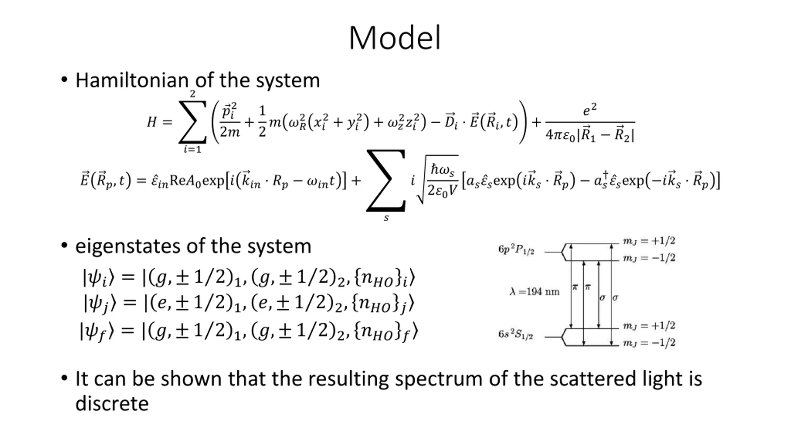 Model Hamiltonian of the system 2 2 ?2 ?? 2?+1 2+ ?? 2+ ?? 2 ?? ? ??,? 2?? 2?? ? = 2? ?? + 4??0|?1 ?2| ?=1 ?? 2?0??? ??exp ??? ?? ?? ??exp ??? ?? ? ??,? = ???Re?0exp ? ??? ?? ???? + ? ? eigenstates of the system |?? = | ?, |?? = | ?, |?? = | ?, 1 21, ?, 1 21, ?, 1 21, ?, 1 22, ??? ? 1 22, ??? ? 1 22, ??? ? It can be shown that the resulting spectrum of the scattered light is discrete