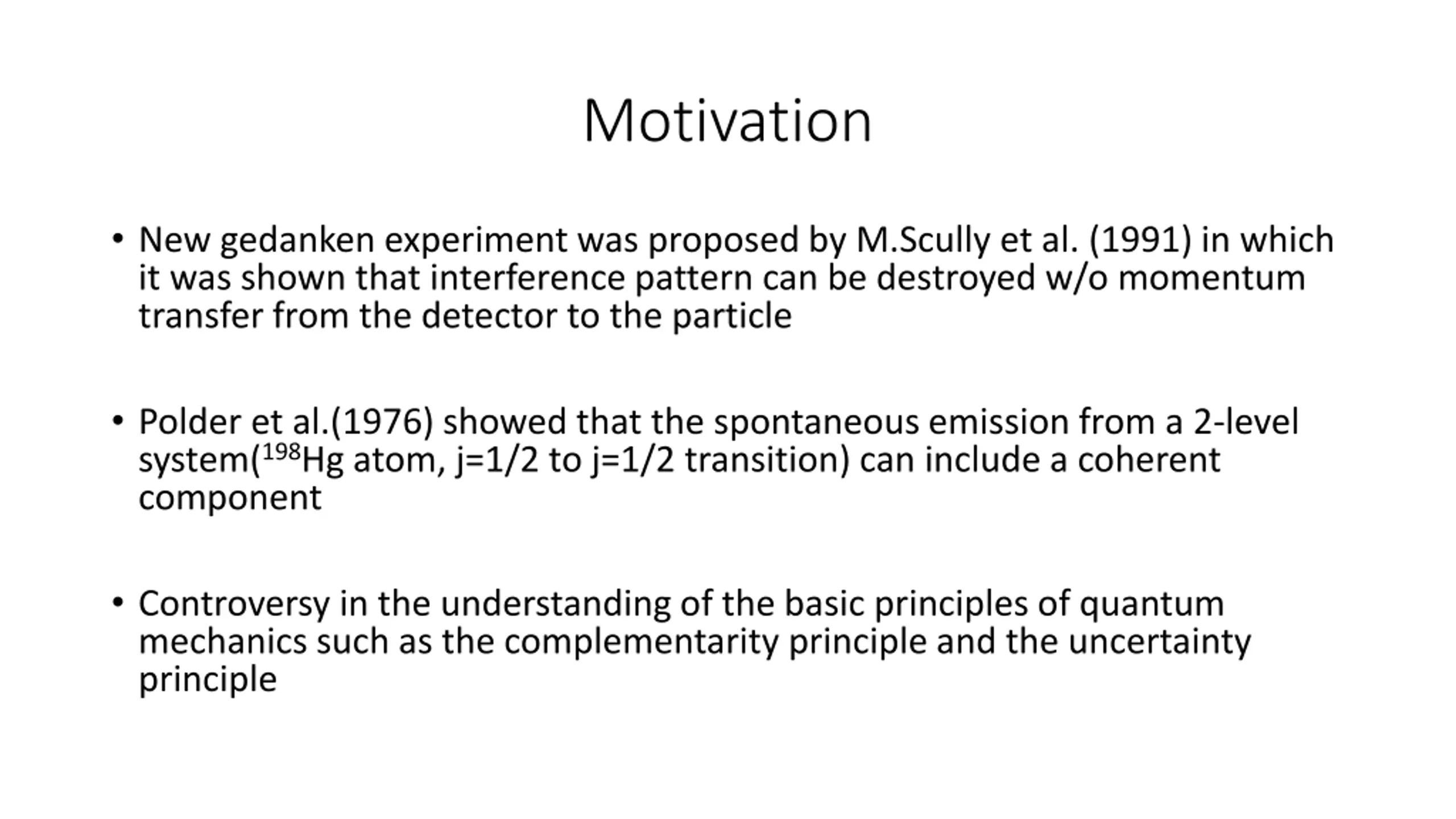 Motivation New gedanken experiment was proposed by M.Scully et al. (1991) in which it was shown that interference pattern can be destroyed w/o momentum transfer from the detector to the particle Polder et al.(1976) showed that the spontaneous emission from a 2-level system(198Hg atom, j=1/2 to j=1/2 transition) can include a coherent component Controversy in the understanding of the basic principles of quantum mechanics such as the complementarity principle and the uncertainty principle