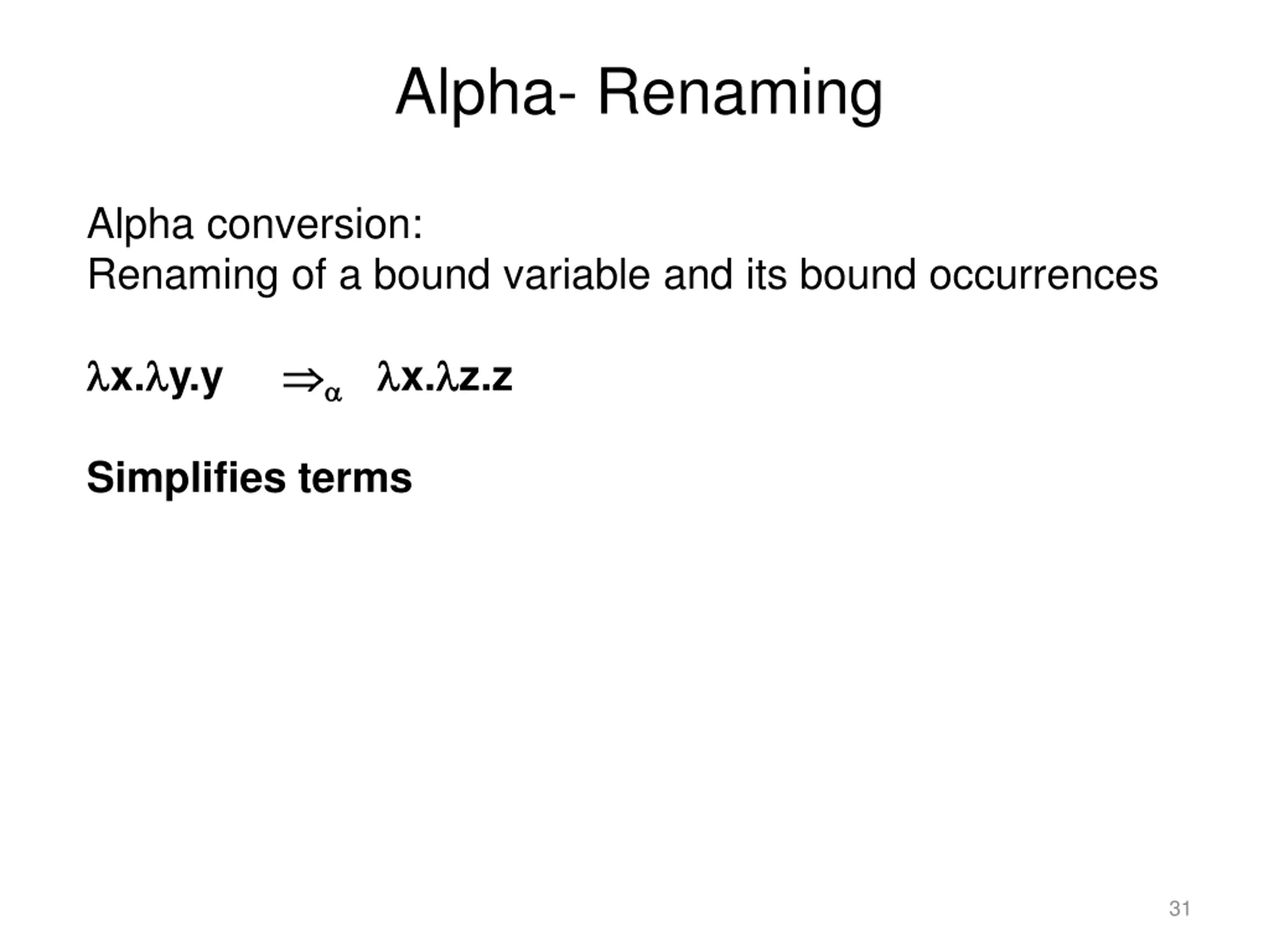 Alpha- Renaming Alpha conversion: Renaming of a bound variable and its bound occurrences x. y.y x. z.z Simplifies terms 31