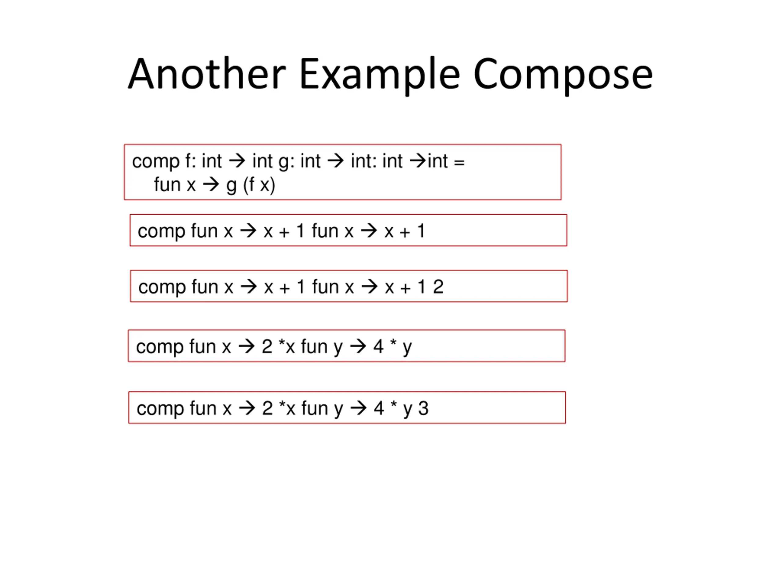 Another Example Compose comp f: int int g: int int: int int = fun x g (f x) comp fun x x + 1 fun x x + 1 comp fun x x + 1 fun x x + 1 2 comp fun x 2 *x fun y 4 * y comp fun x 2 *x fun y 4 * y 3