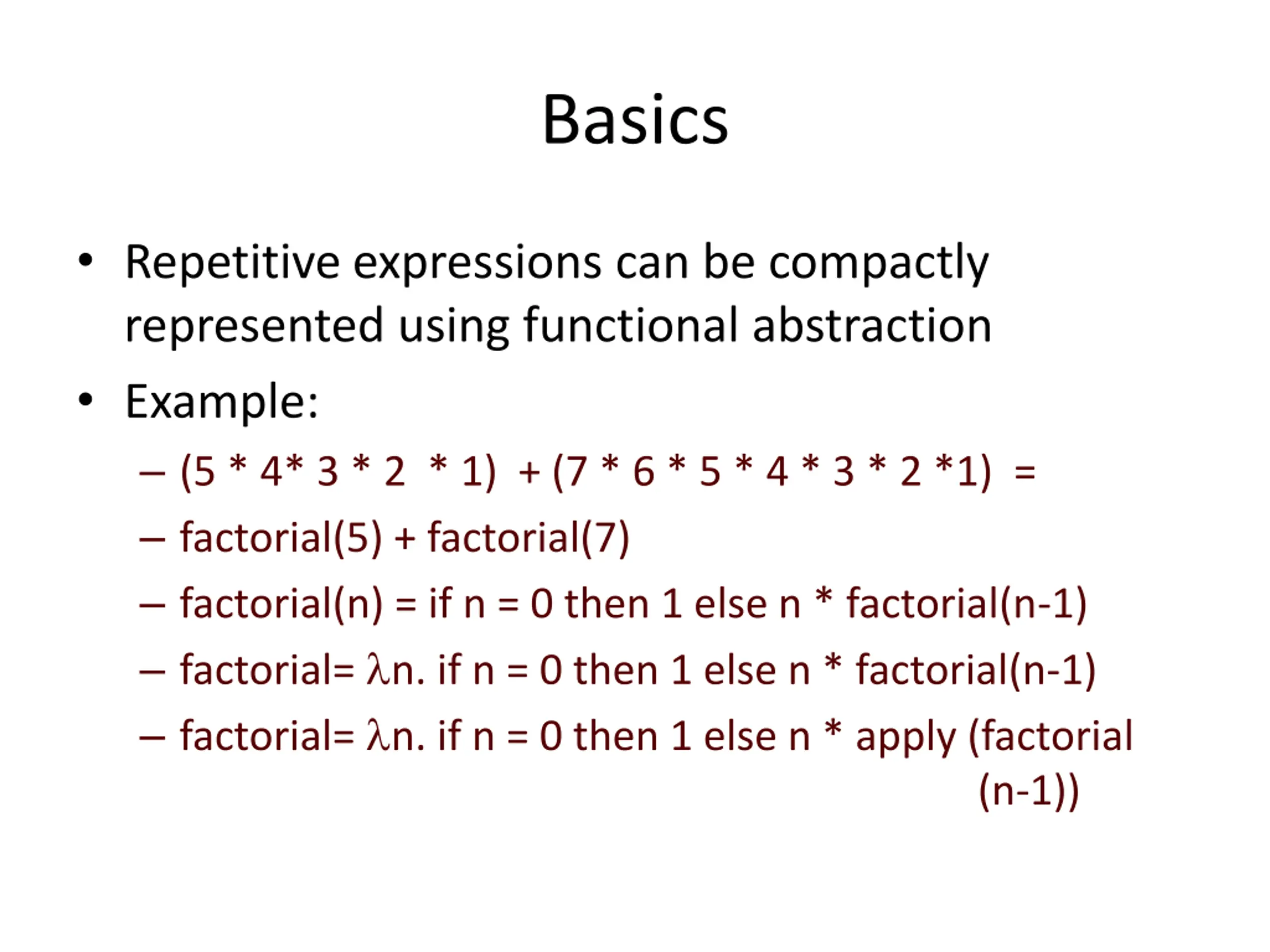 Basics Repetitive expressions can be compactly represented using functional abstraction Example: (5 * 4* 3 * 2 * 1) + (7 * 6 * 5 * 4 * 3 * 2 *1) = factorial(5) + factorial(7) factorial(n) = if n = 0 then 1 else n * factorial(n-1) factorial= n. if n = 0 then 1 else n * factorial(n-1) factorial= n. if n = 0 then 1 else n * apply (factorial (n-1))