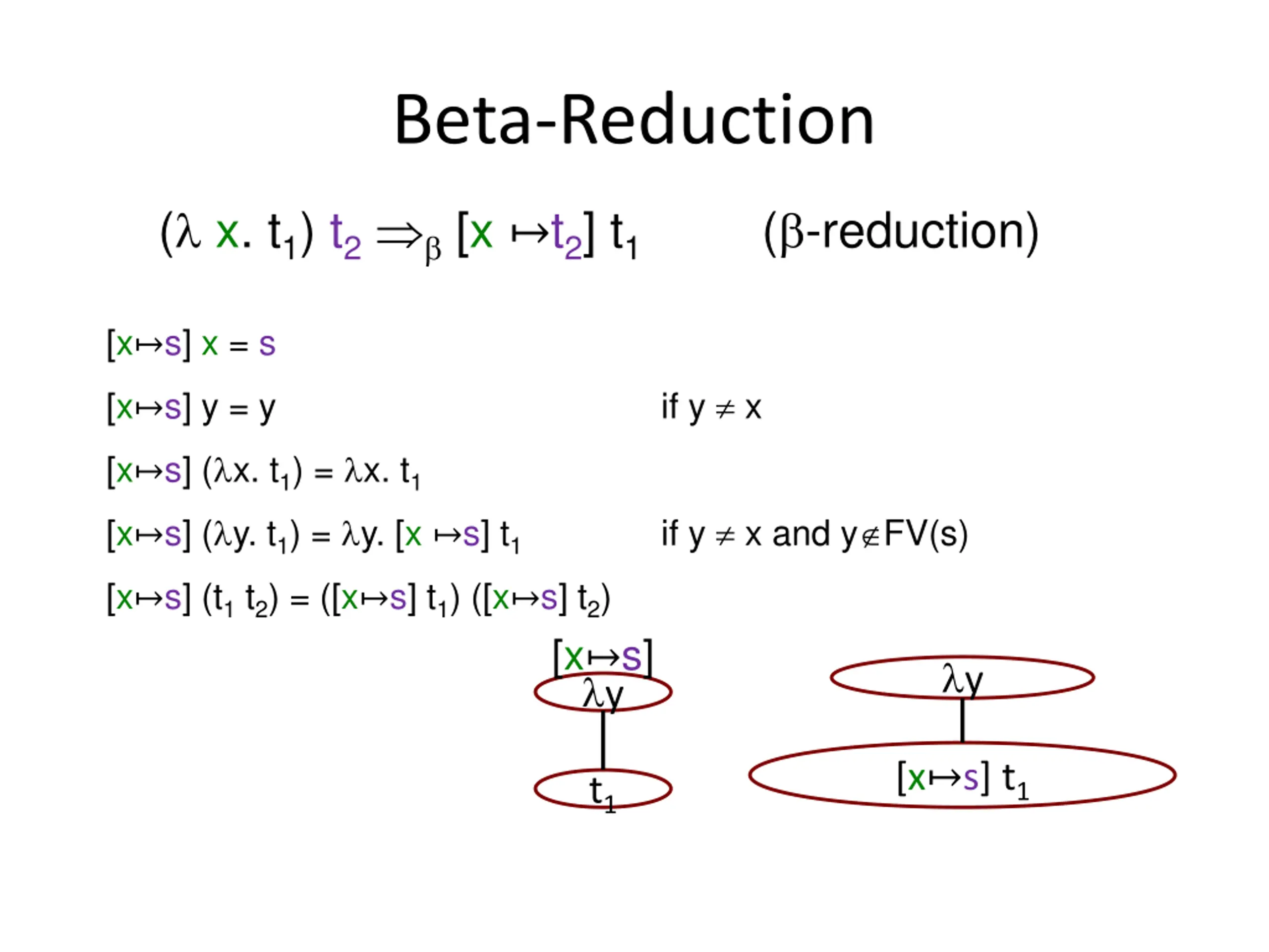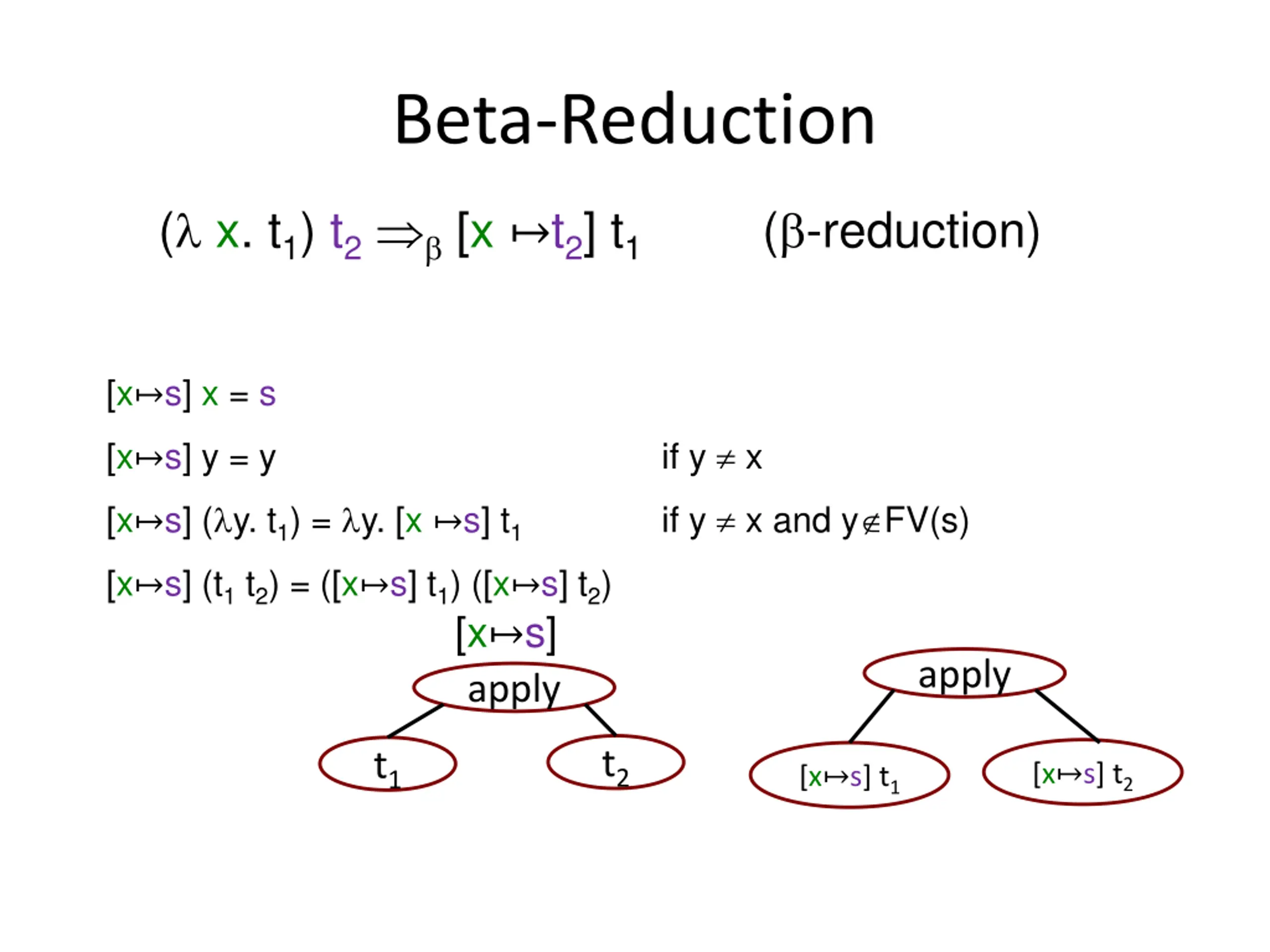 Beta-Reduction ( x. t1) t2 [x t2] t1 ( -reduction) [x s] x = s if y x [x s] y = y [x s] ( y. t1) = y. [x s] t1 [x s] (t1 t2) = ([x s] t1) ([x s] t2) if y x and y FV(s) [x s] apply apply t2 t1 [x s] t2 [x s] t1