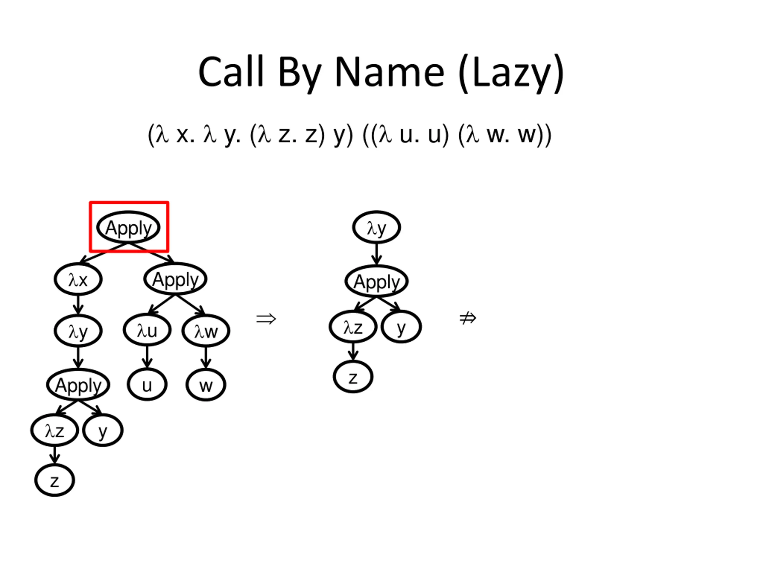 Call By Name (Lazy) ( x. y. ( z. z) y) (( u. u) ( w. w)) y Apply x Apply Apply z y u y w z u Apply w z y z