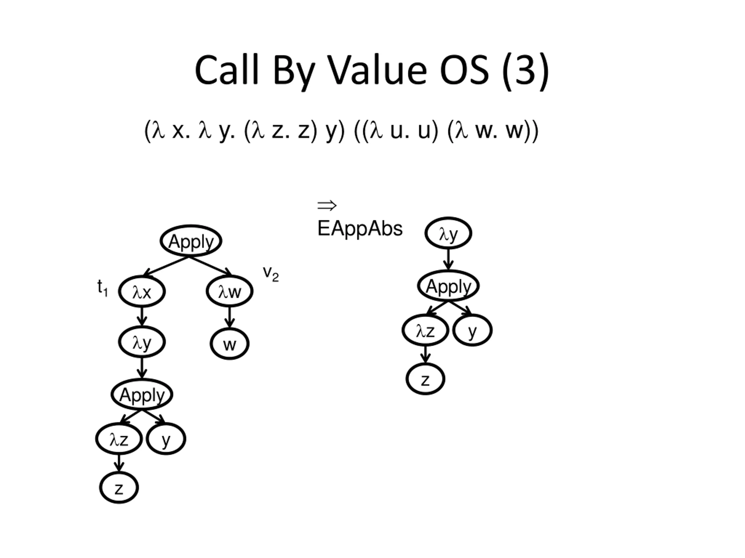 Call By Value OS (3) ( x. y. ( z. z) y) (( u. u) ( w. w)) EAppAbs y Apply v2 t1 Apply w x z y y w z Apply z y z