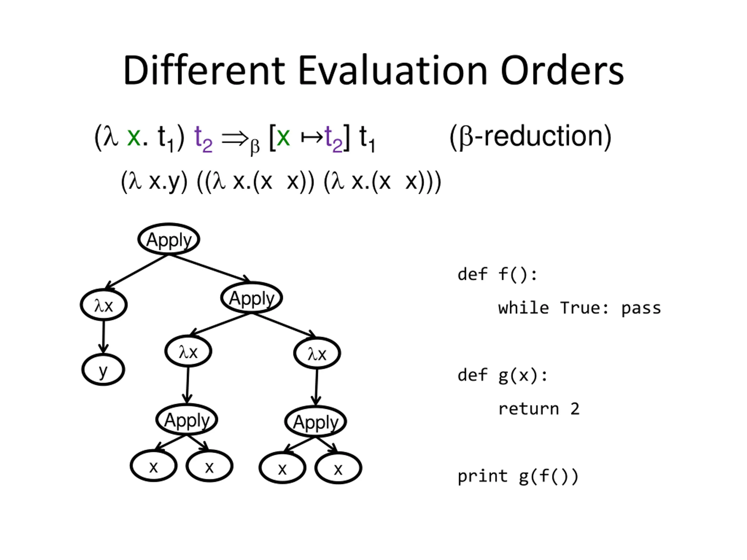 Different Evaluation Orders ( x. t1) t2 [x t2] t1 ( x.y) (( x.(x x)) ( x.(x x))) ( -reduction) Apply def f(): Apply x while True: pass x x y def g(x): return 2 Apply Apply x x x x print g(f())