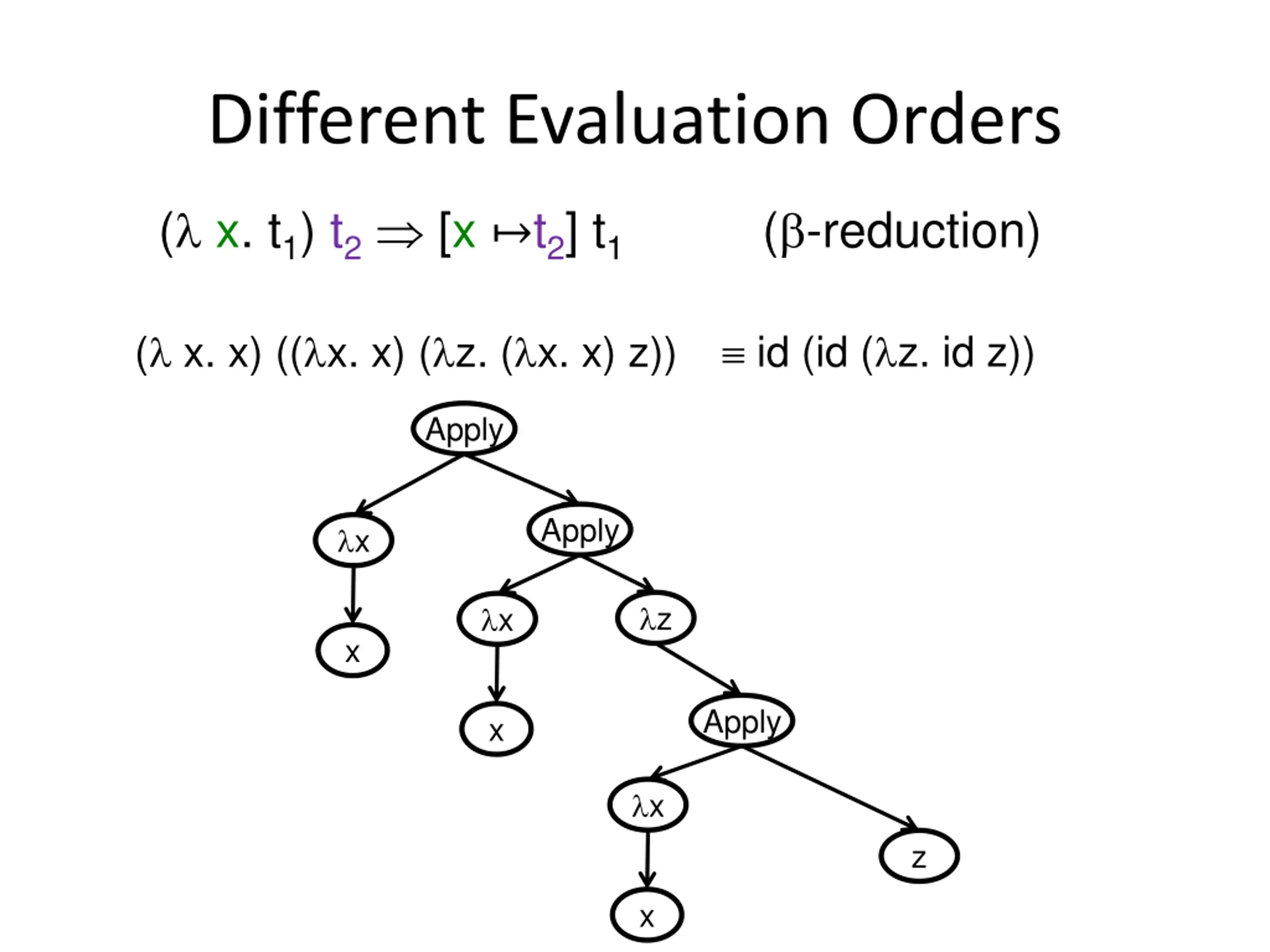 Different Evaluation Orders ( x. t1) t2 [x t2] t1 ( -reduction) id (id ( z. id z)) ( x. x) (( x. x) ( z. ( x. x) z)) Apply Apply x z x x Apply x x z x