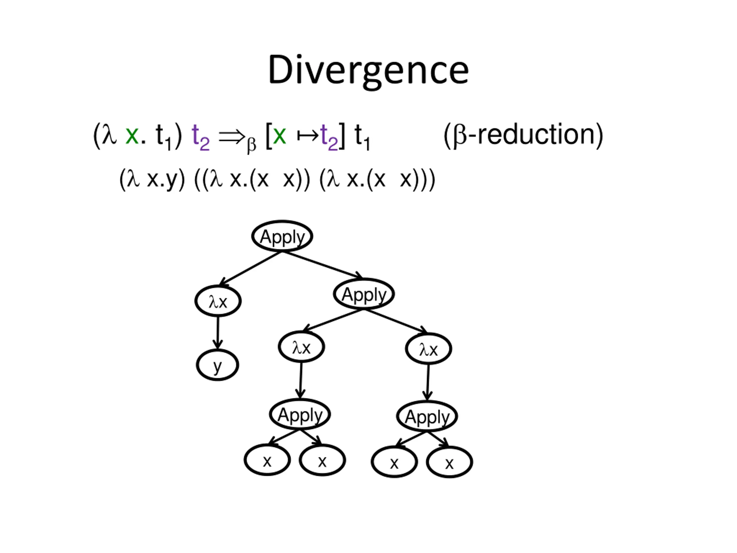 Divergence ( x. t1) t2 [x t2] t1 ( x.y) (( x.(x x)) ( x.(x x))) ( -reduction) Apply Apply x x x y Apply Apply x x x x