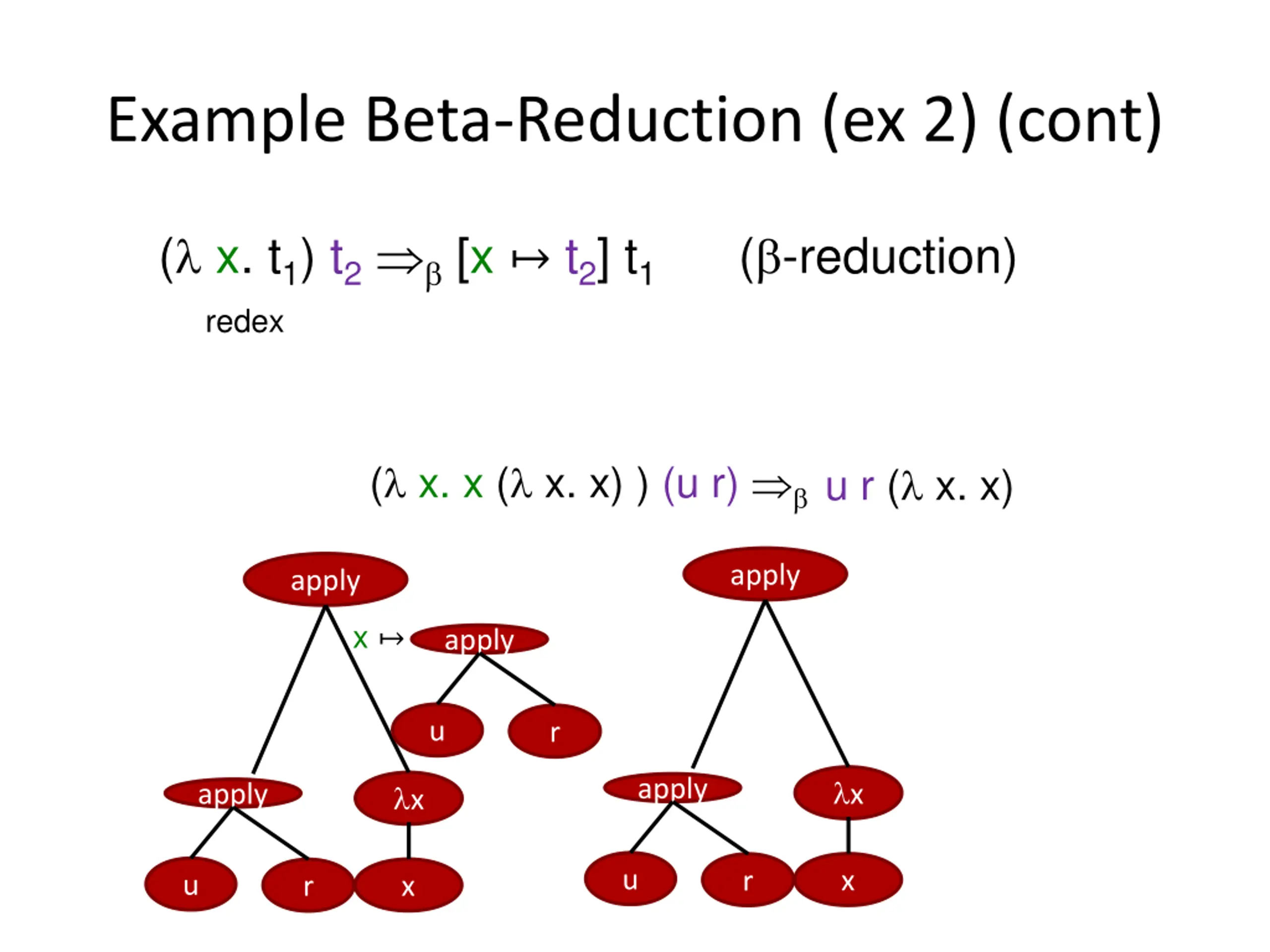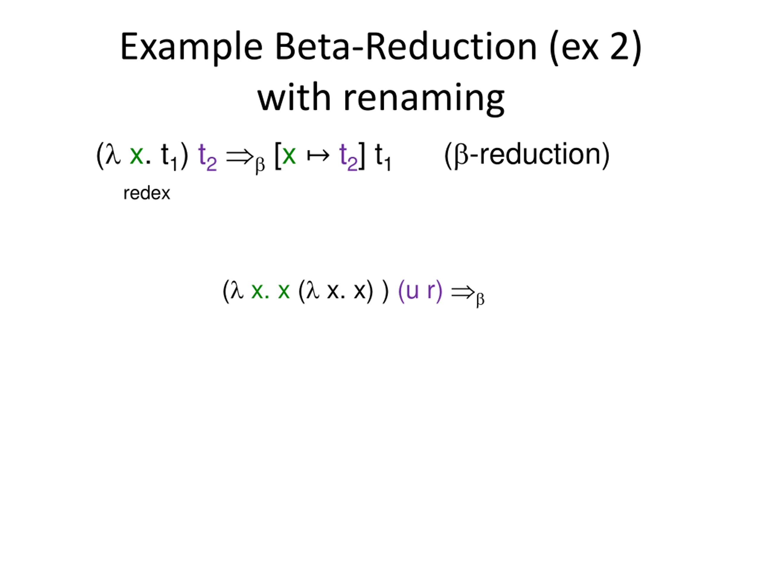 Example Beta-Reduction (ex 2) with renaming ( x. t1) t2 [x t2] t1 redex ( -reduction) ( x. x ( x. x) ) (u r)