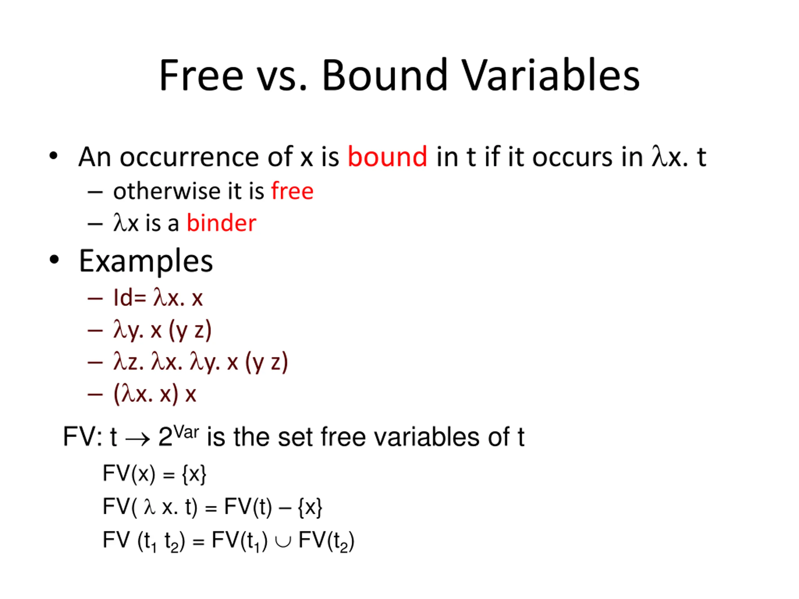 Free vs. Bound Variables An occurrence of x is bound in t if it occurs in x. t otherwise it is free x is a binder Examples Id= x. x y. x (y z) z. x. y. x (y z) ( x. x) x FV: t 2Var is the set free variables of t FV(x) = {x} FV( x. t) = FV(t) {x} FV (t1 t2) = FV(t1) FV(t2)
