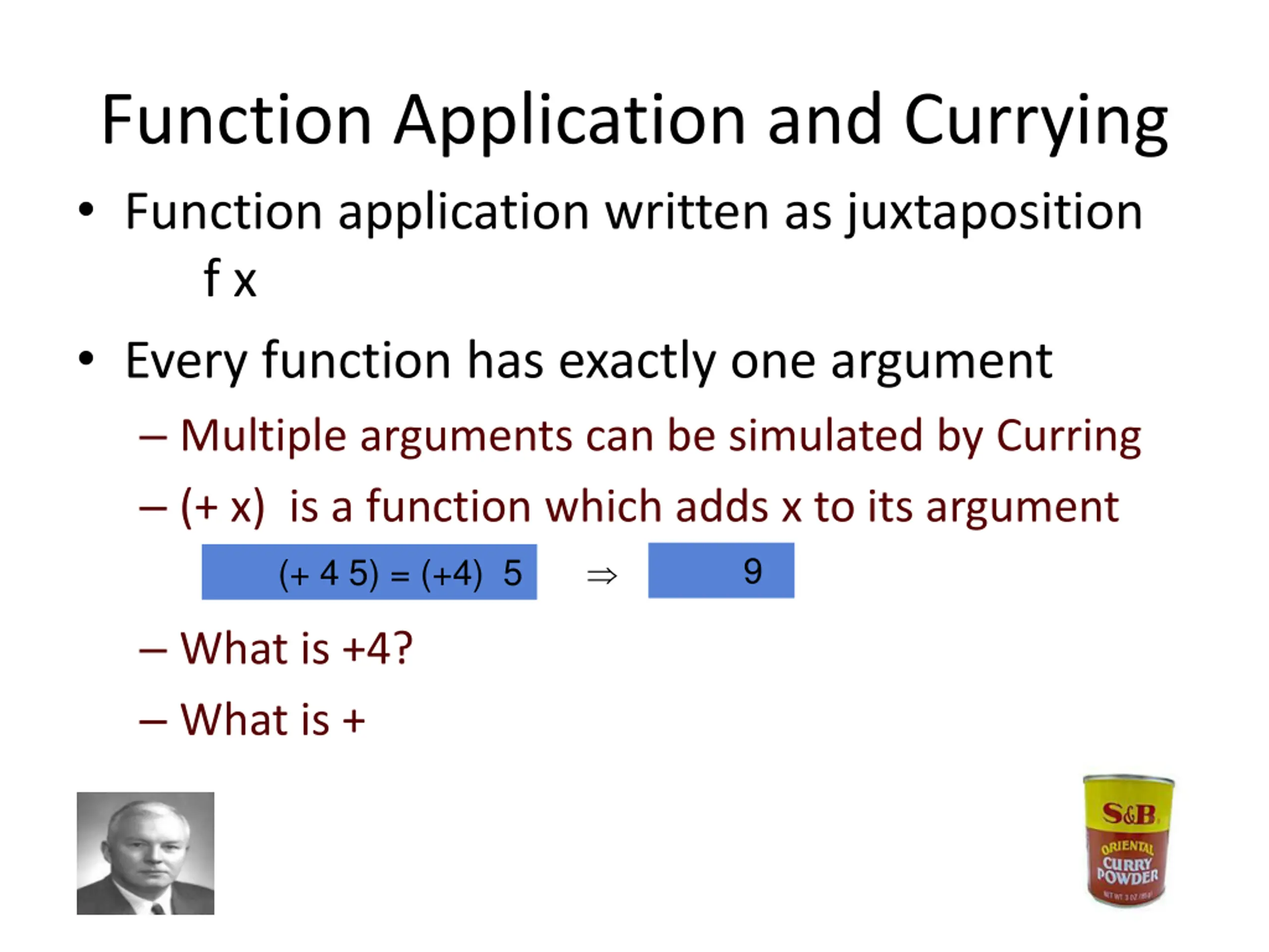 Function Application and Currying Function application written as juxtaposition f x Every function has exactly one argument Multiple arguments can be simulated by Curring (+ x) is a function which adds x to its argument (+ 4 5) = (+4) 5 9 What is +4? What is +