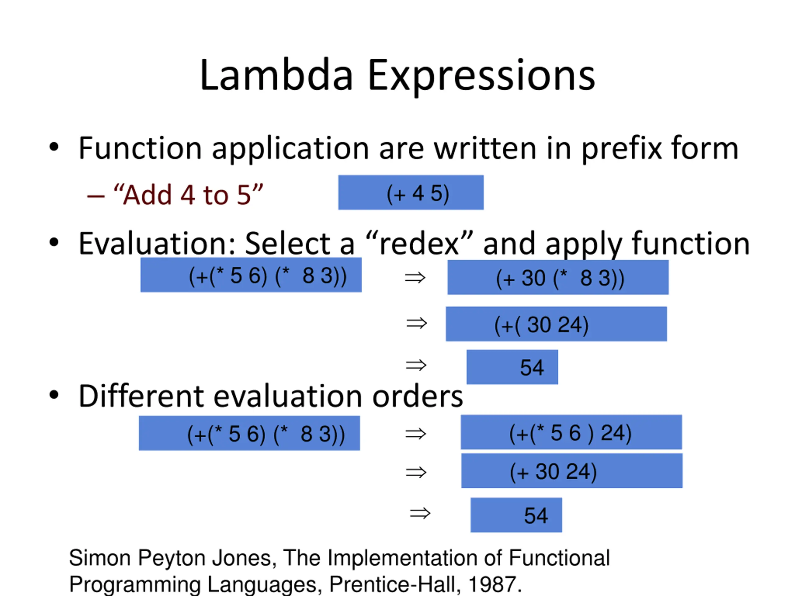 Lambda Expressions Function application are written in prefix form Add 4 to 5 Evaluation: Select a redex and apply function (+(* 5 6) (* 8 3)) (+ 4 5) (+ 30 (* 8 3)) (+( 30 24) 54 Different evaluation orders (+(* 5 6) (* 8 3)) (+(* 5 6 ) 24) (+ 30 24) 54 Simon Peyton Jones, The Implementation of Functional Programming Languages, Prentice-Hall, 1987.