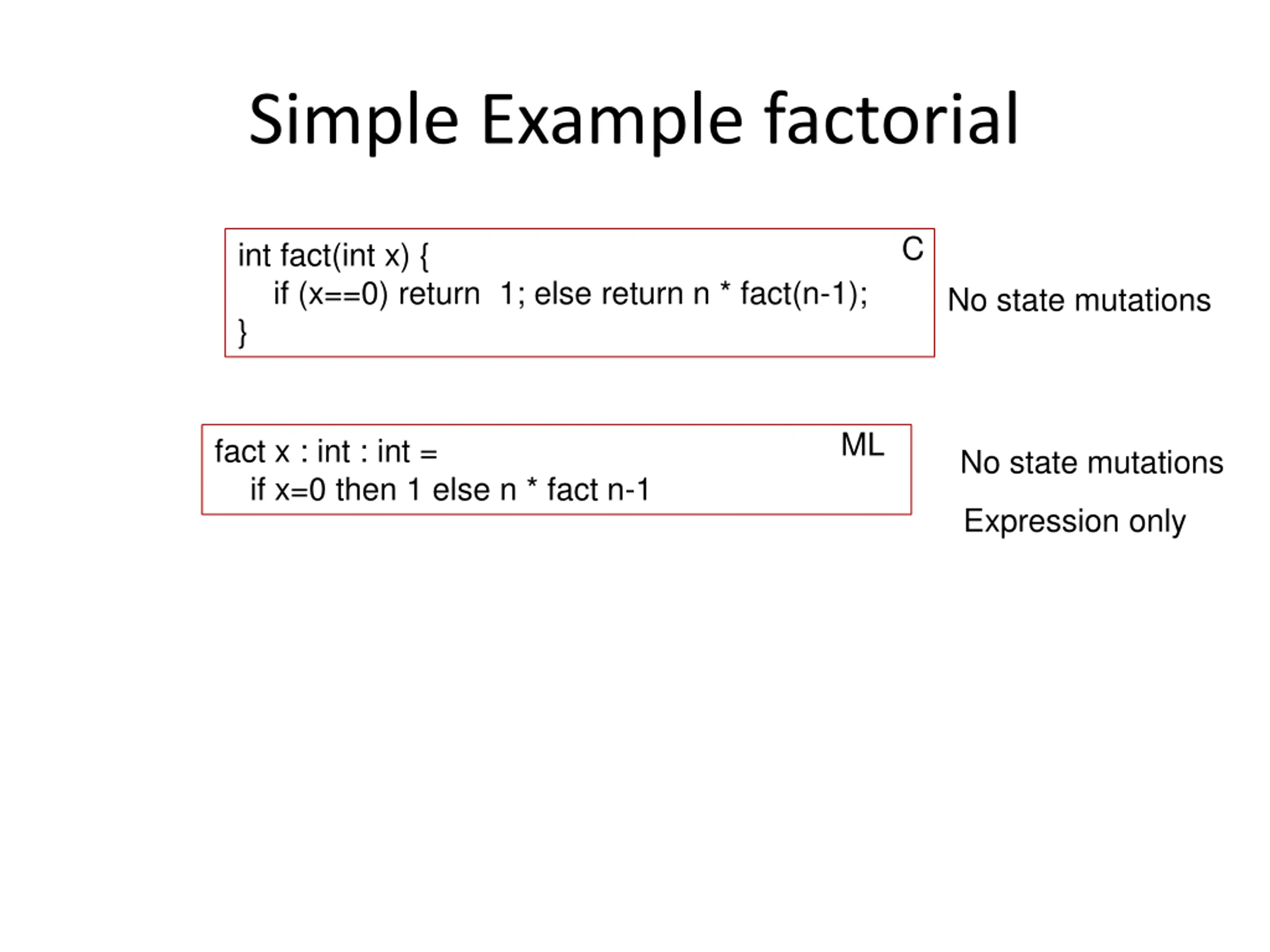 Simple Example factorial C int fact(int x) { if (x==0) return 1; else return n * fact(n-1); } No state mutations ML fact x : int : int = if x=0 then 1 else n * fact n-1 No state mutations Expression only