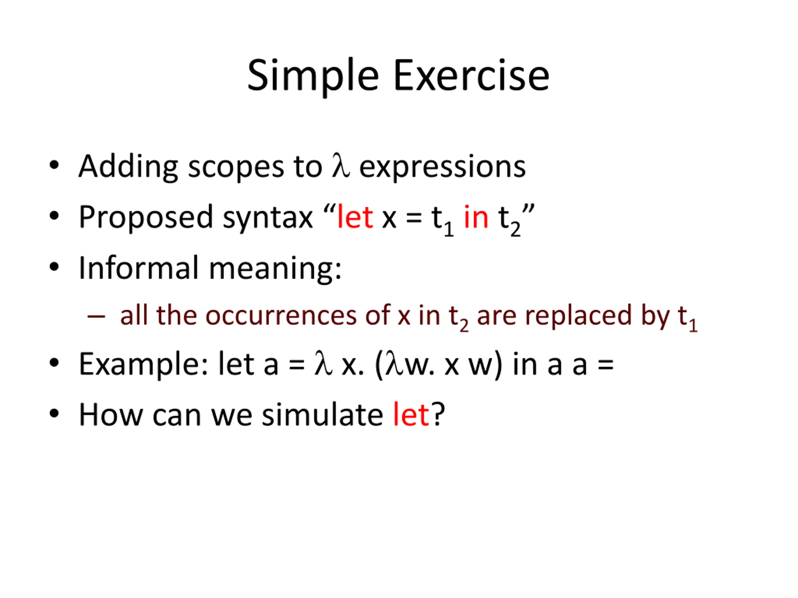 Simple Exercise Adding scopes to expressions Proposed syntax let x = t1 in t2 Informal meaning: all the occurrences of x in t2 are replaced by t1 Example: let a = x. ( w. x w) in a a = How can we simulate let?