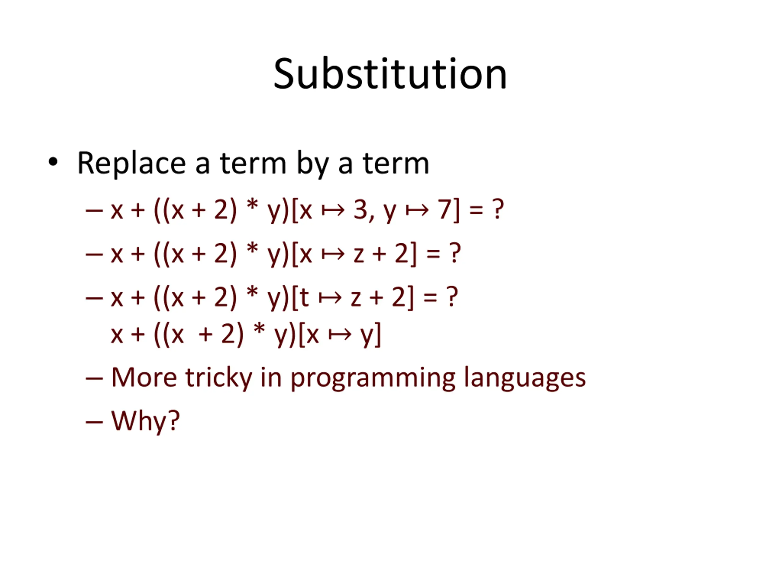 Substitution Replace a term by a term x + ((x + 2) * y)[x 3, y 7] = ? x + ((x + 2) * y)[x z + 2] = ? x + ((x + 2) * y)[t z + 2] = ? x + ((x + 2) * y)[x y] More tricky in programming languages Why?