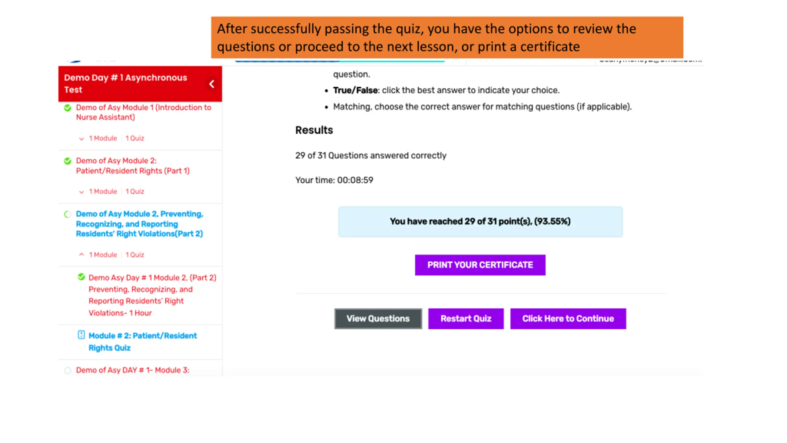 After successfully passing the quiz, you have the options to review the questions or proceed to the next lesson, or print a certificate