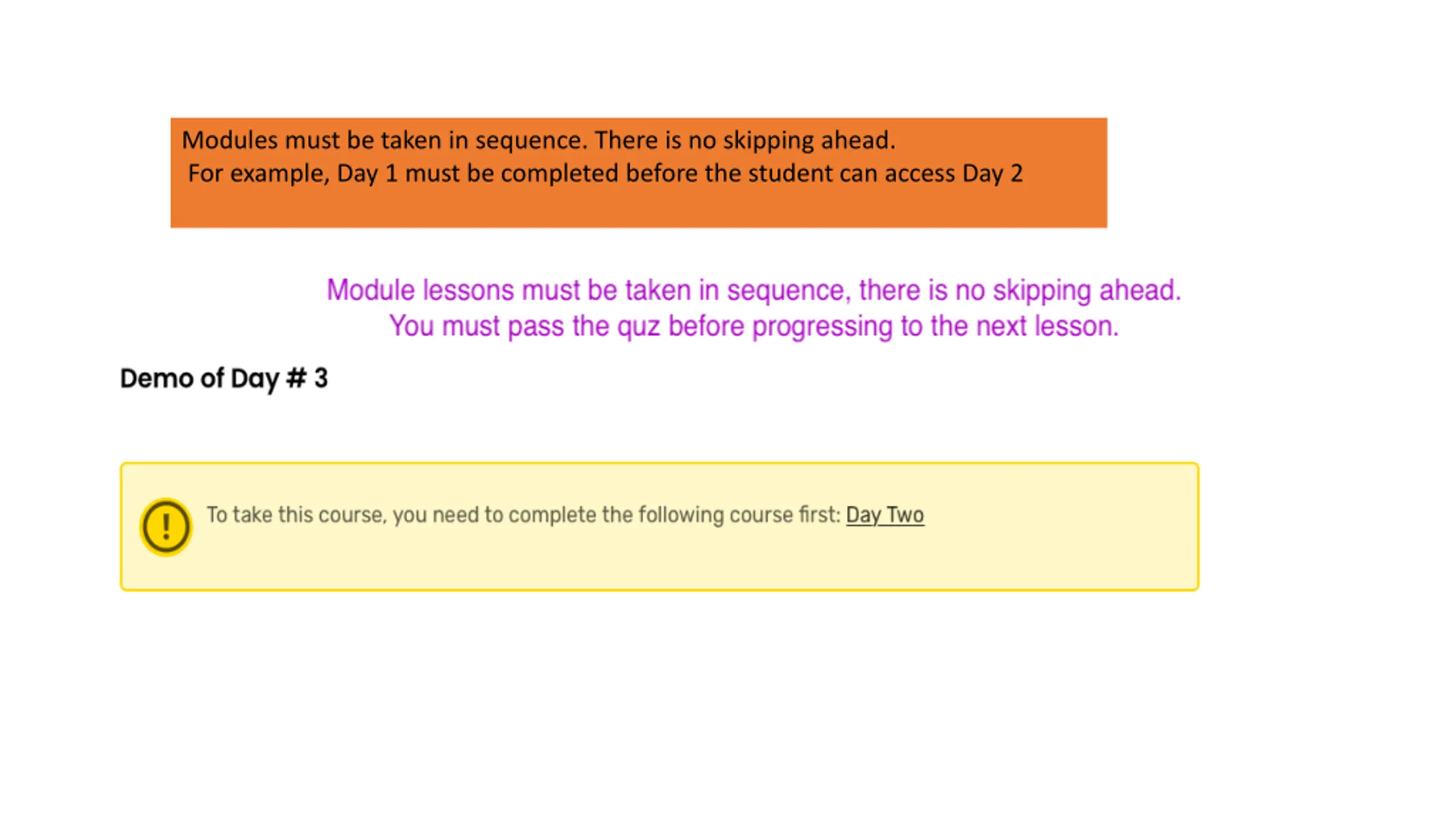 Modules must be taken in sequence. There is no skipping ahead. For example, Day 1 must be completed before the student can access Day 2