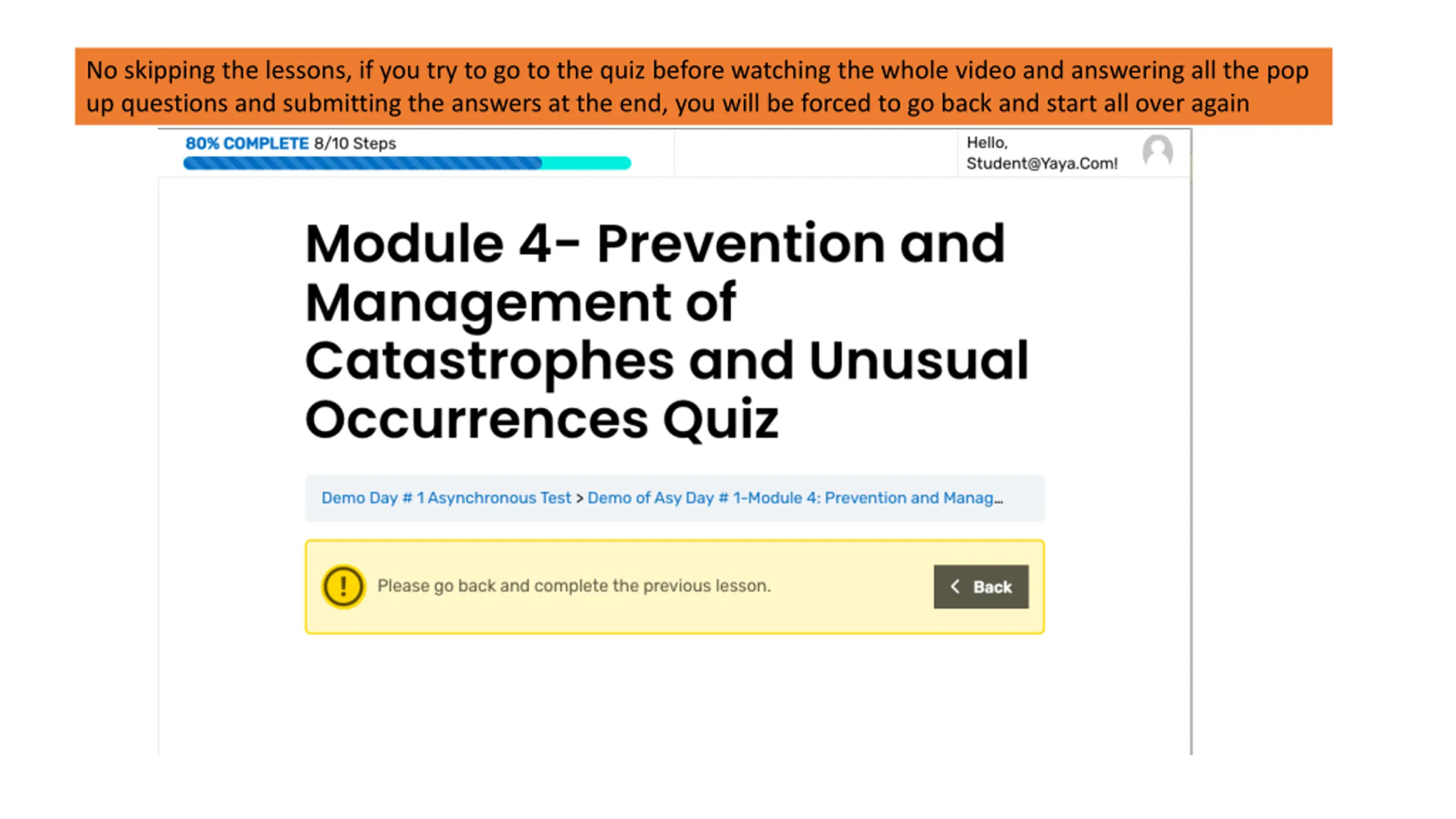 No skipping the lessons, if you try to go to the quiz before watching the whole video and answering all the pop up questions and submitting the answers at the end, you will be forced to go back and start all over again