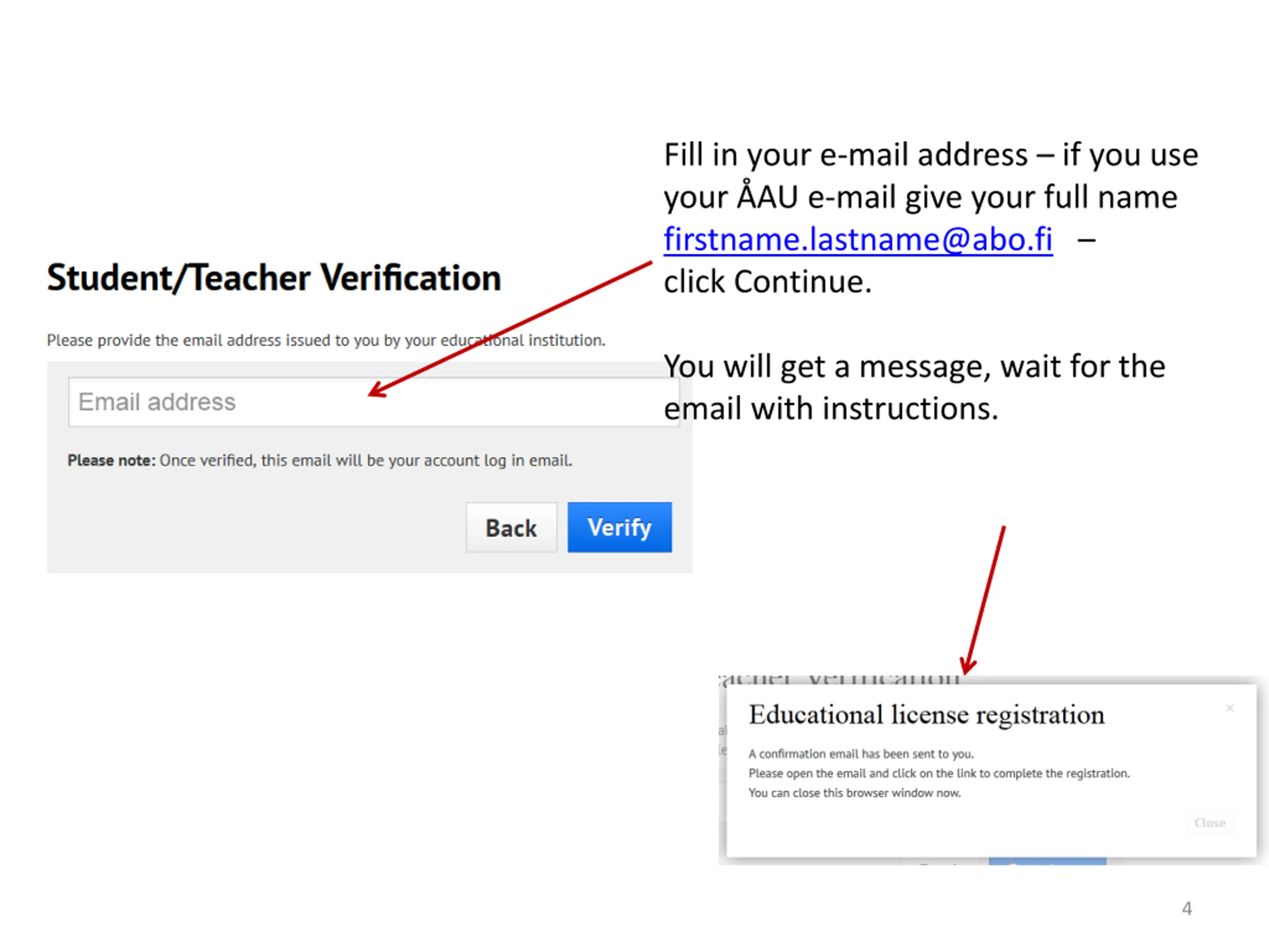 Fill in your e-mail address if you use your AU e-mail give your full name firstname.lastname@abo.fi click Continue. You will get a message, wait for the email with instructions. 4