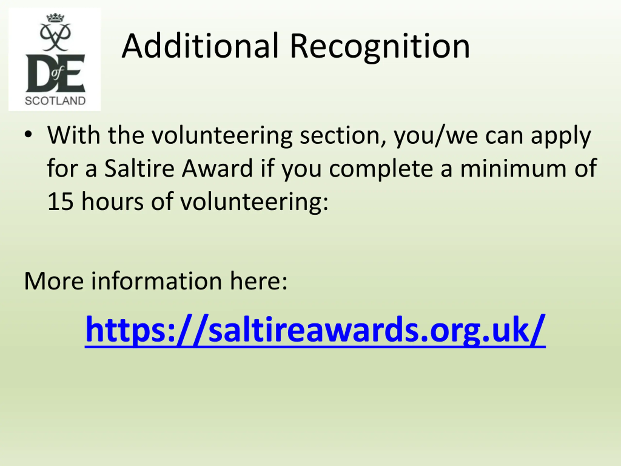 Additional Recognition With the volunteering section, you/we can apply for a Saltire Award if you complete a minimum of 15 hours of volunteering: More information here: https://saltireawards.org.uk/