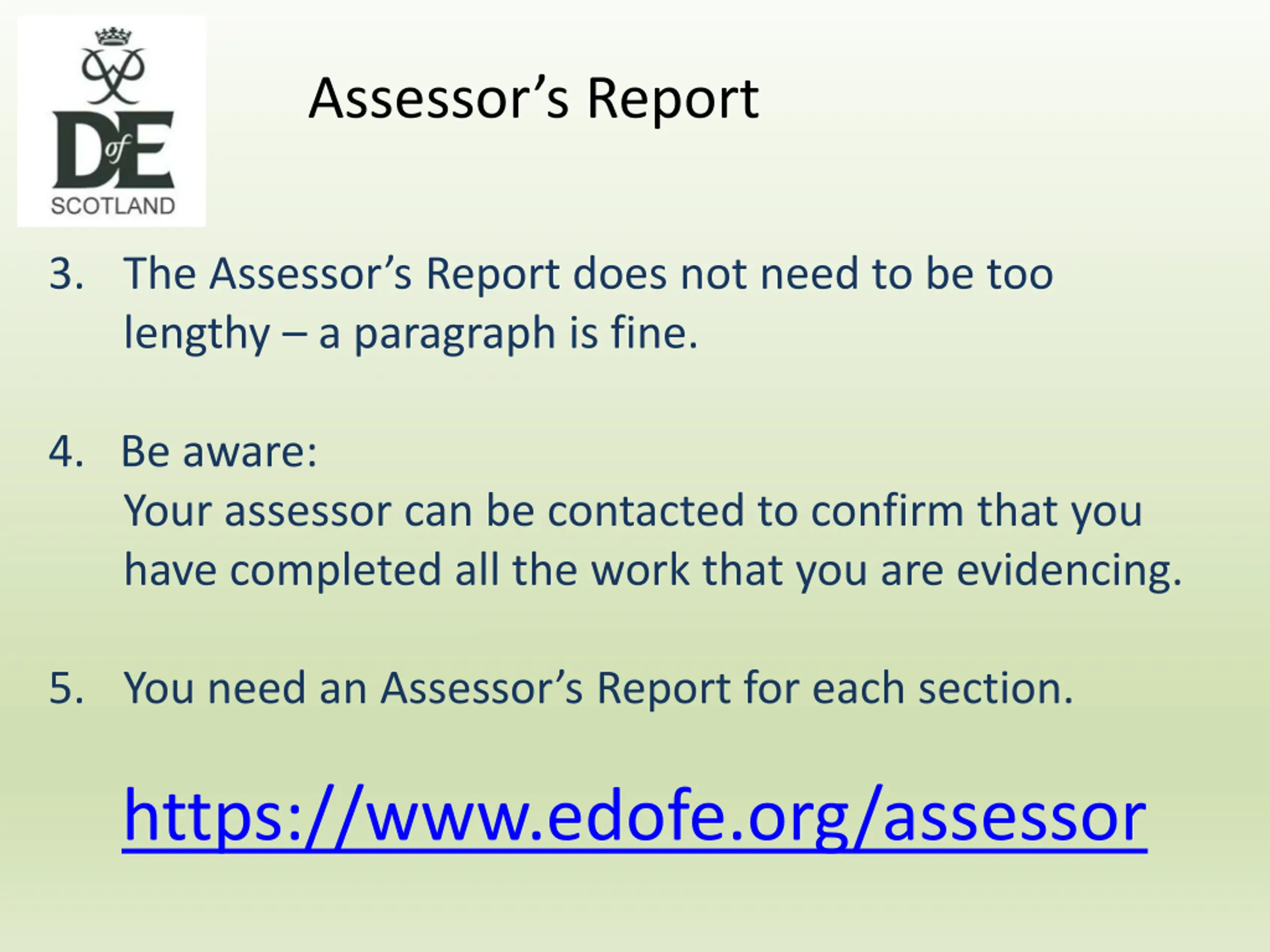 Assessors Report 3.The Assessor s Report does not need to be too lengthy a paragraph is fine. Be aware: Your assessor can be contacted to confirm that you have completed all the work that you are evidencing. 5.You need an Assessor s Report for each section. https://www.edofe.org/assessor 3. The Assessor s Report does not need to be too lengthy a paragraph is fine. 4. Be aware: Your assessor can be contacted to confirm that you have completed all the work that you are evidencing. 5. You need an Assessor s Report for each section. https://www.edofe.org/assessor