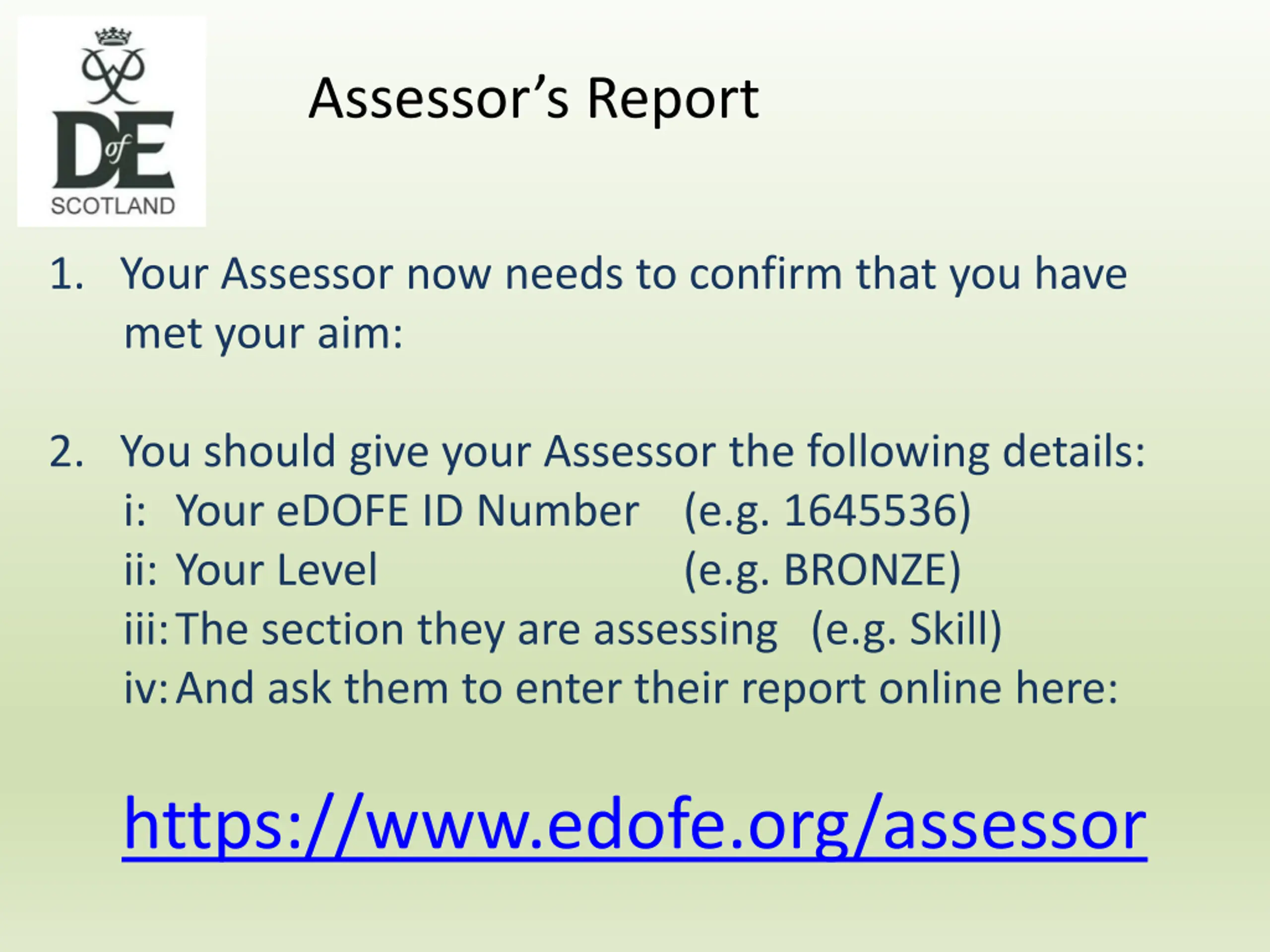 Assessors Report Your Assessor now needs to confirm that you have met your aim: You should give your Assessor the following details: i:Your eDOFE ID Number (e.g. 1645536) ii:Your Level(e.g. BRONZE) iii:The section they are assessing(e.g. Skill) iv:And ask them to enter their report online here: https://www.edofe.org/assessor 1. Your Assessor now needs to confirm that you have met your aim: 2. You should give your Assessor the following details: i: Your eDOFE ID Number (e.g. 1645536) ii: Your Level iii: The section they are assessing (e.g. Skill) iv: And ask them to enter their report online here: (e.g. BRONZE) https://www.edofe.org/assessor