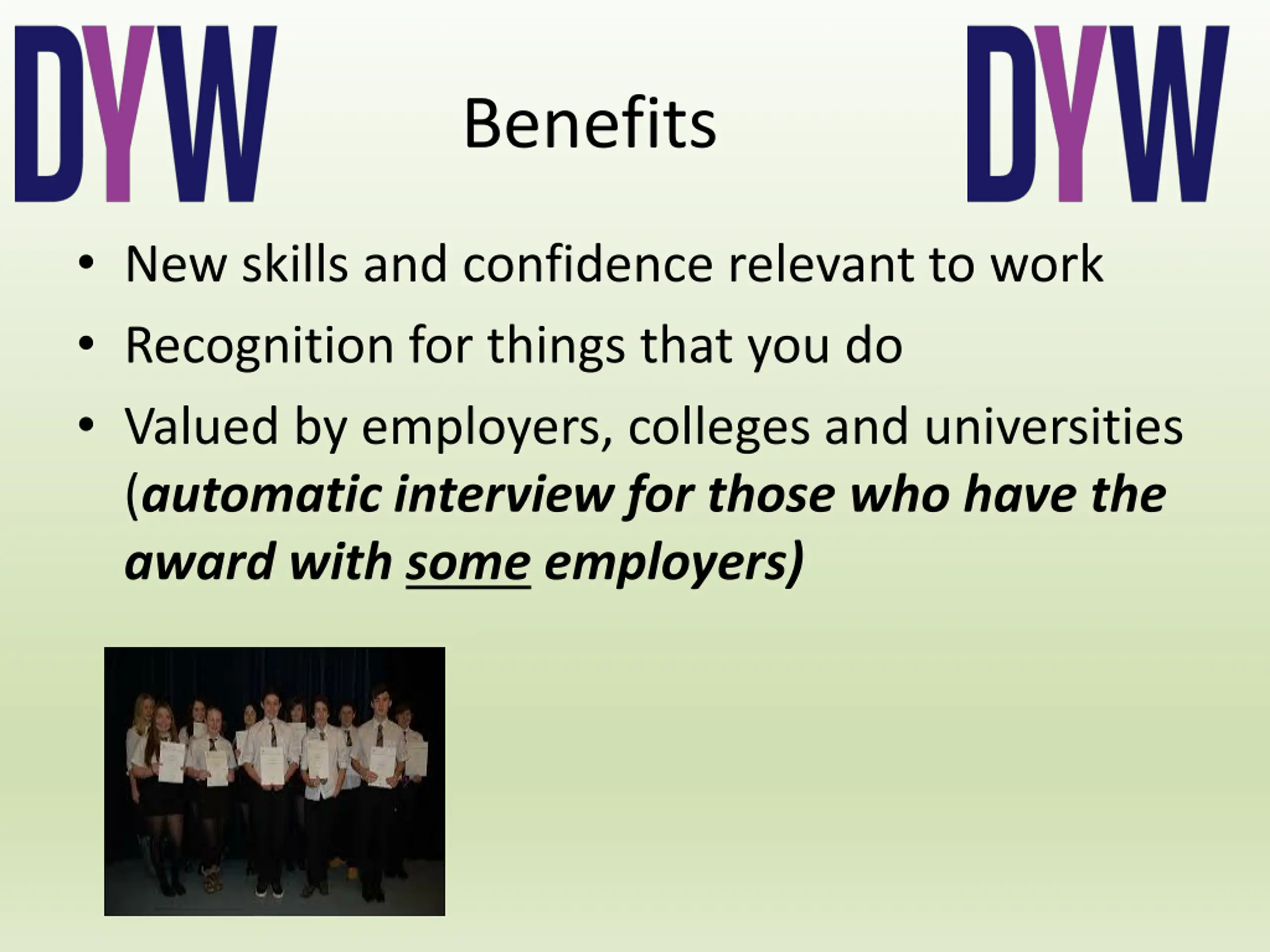 Benefits New skills and confidence relevant to work Recognition for things that you do Valued by employers, colleges and universities (automatic interview for those who have the award with some employers)