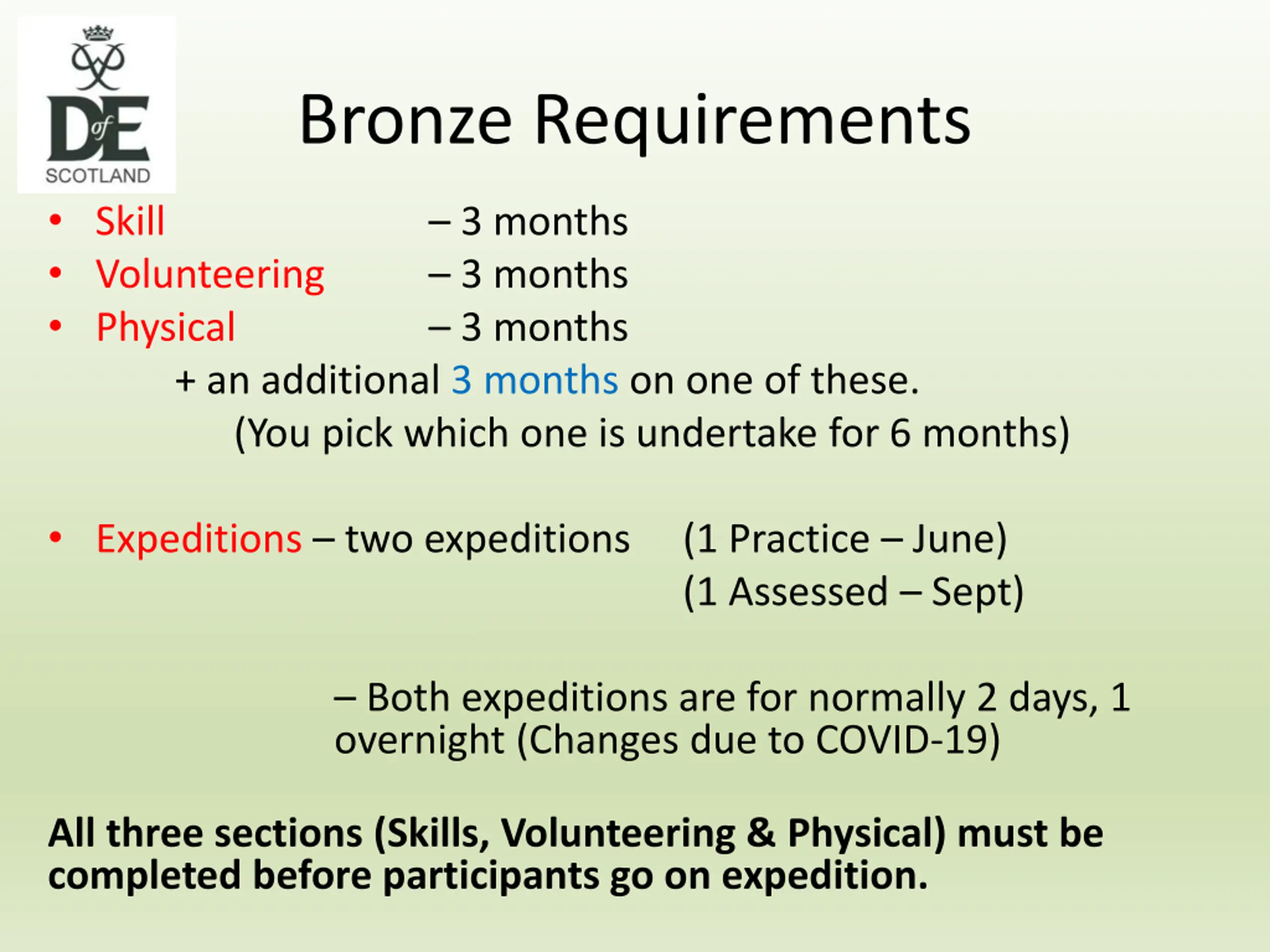 Bronze Requirements Skill Volunteering Physical + an additional 3 months on one of these. (You pick which one is undertake for 6 months) 3 months 3 months 3 months Expeditions two expeditions (1 Practice June) (1 Assessed Sept) Both expeditions are for normally 2 days, 1 overnight (Changes due to COVID-19) All three sections (Skills, Volunteering & Physical) must be completed before participants go on expedition.