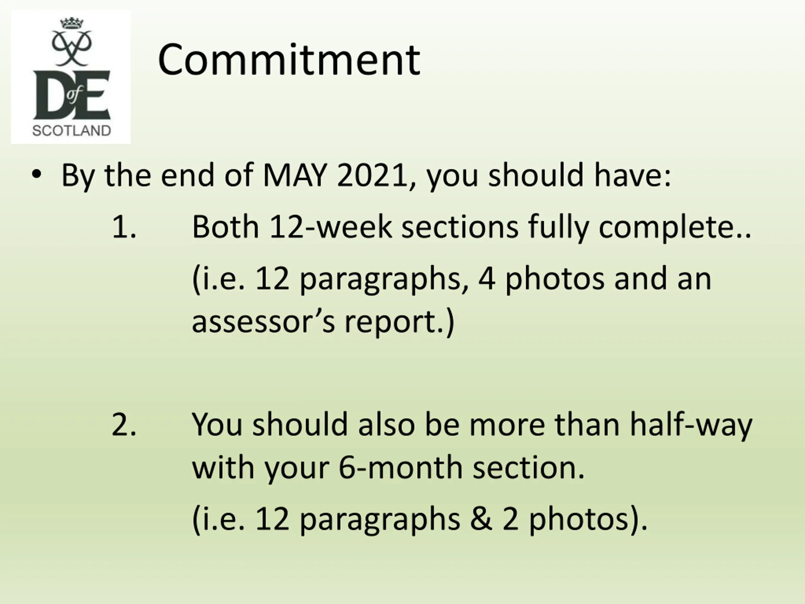 Commitment By the end of MAY 2021, you should have: 1. Both 12-week sections fully complete.. (i.e. 12 paragraphs, 4 photos and an assessor s report.) 2. You should also be more than half-way with your 6-month section. (i.e. 12 paragraphs & 2 photos).