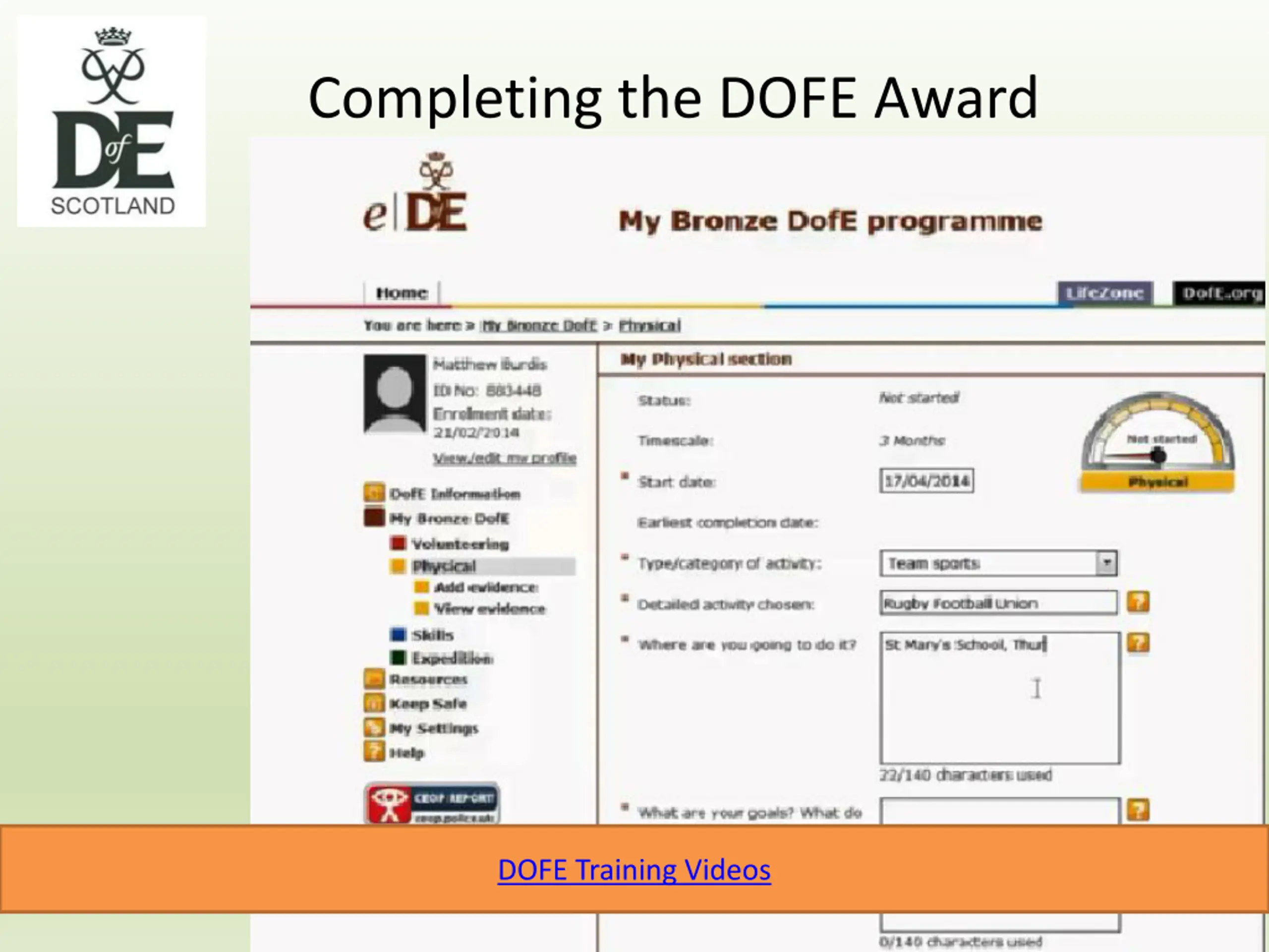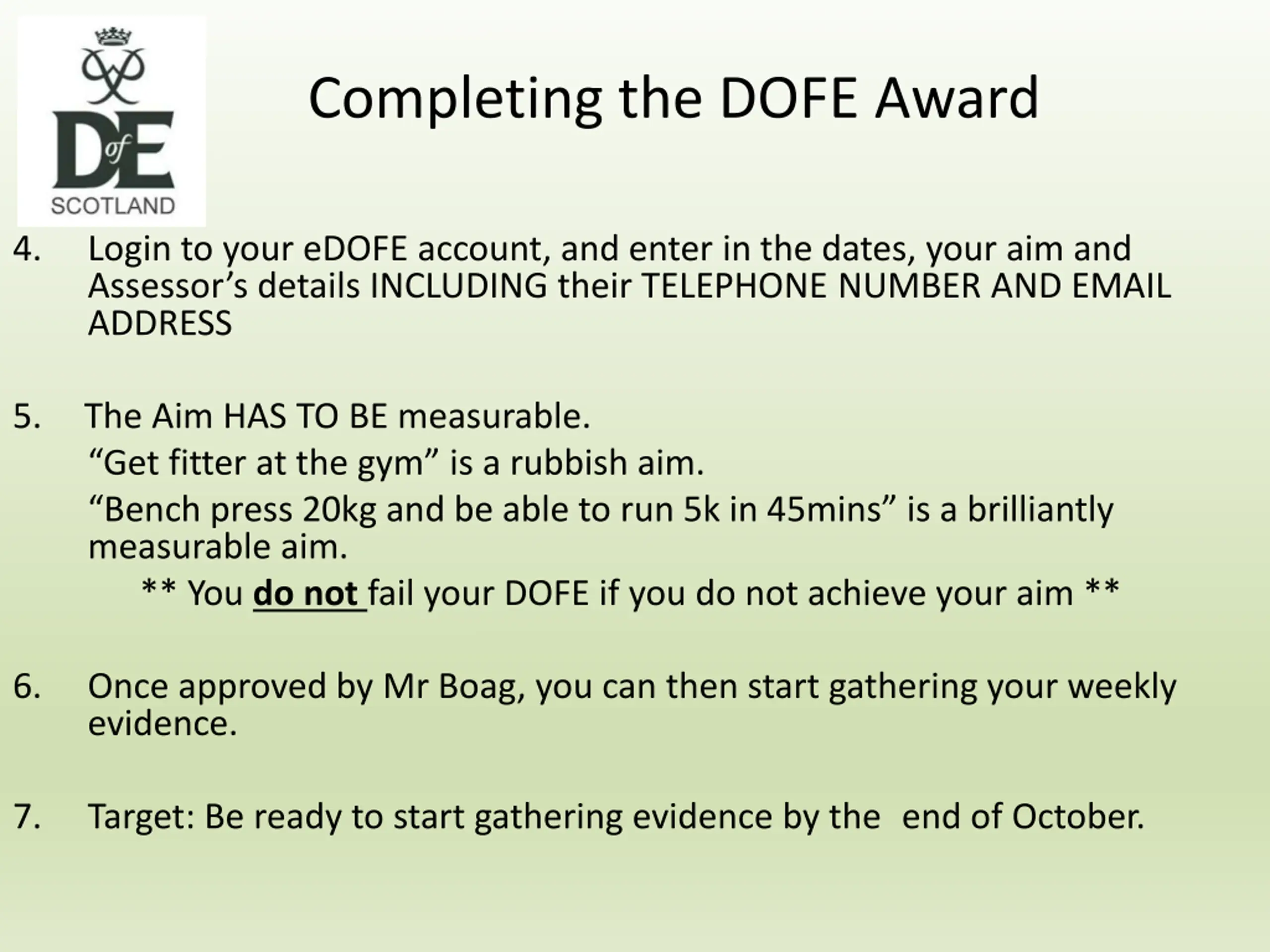 Completing the DOFE Award 4. Login to your eDOFE account, and enter in the dates, your aim and Assessor s details INCLUDING their TELEPHONE NUMBER AND EMAIL ADDRESS 5. The Aim HAS TO BE measurable. Get fitter at the gym is a rubbish aim. Bench press 20kg and be able to run 5k in 45mins is a brilliantly measurable aim. ** You do not fail your DOFE if you do not achieve your aim ** 6. Once approved by Mr Boag, you can then start gathering your weekly evidence. 7. Target: Be ready to start gathering evidence by the end of October.