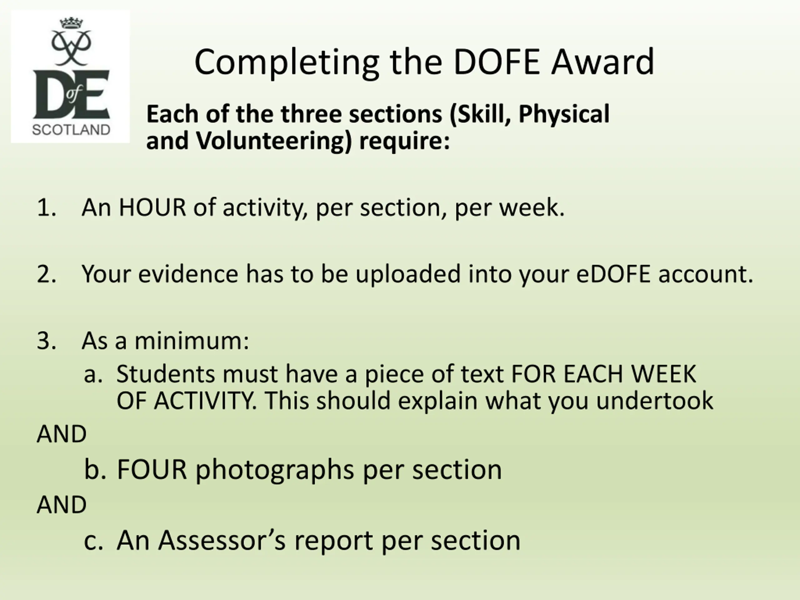Completing the DOFE Award Each of the three sections (Skill, Physical and Volunteering) require: 1. An HOUR of activity, per section, per week. 2. Your evidence has to be uploaded into your eDOFE account. 3. As a minimum: a. Students must have a piece of text FOR EACH WEEK OF ACTIVITY. This should explain what you undertook AND b. FOUR photographs per section AND c. An Assessor s report per section
